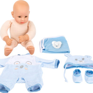 🧢 Mukana vaatteet, hattu, tutti ja peitto realistiseen leikkiin.