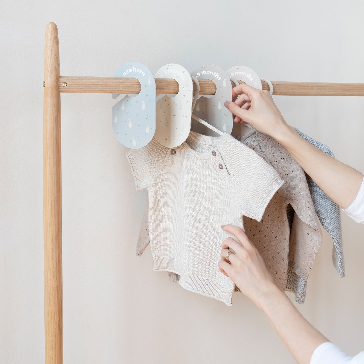 Käytännölliset kaapinjakajat, joiden avulla pidät lapsen vaatteet järjestyksessä vaatekaapissa. Täydellinen tapa erotella uudet ja ystävältä perityt vaatteet tai järjestää ne kokojen mukaan. Setti sisältää 8 kappaletta kaapinjakajia, ja jokaisen molemmille puolille on painettu ikämerkintä englanniksi: Newborn, 0–3 months, 3–6 months, 6–9 months, 9–12 months, 12–18 months, 18–24 months, 2 years.