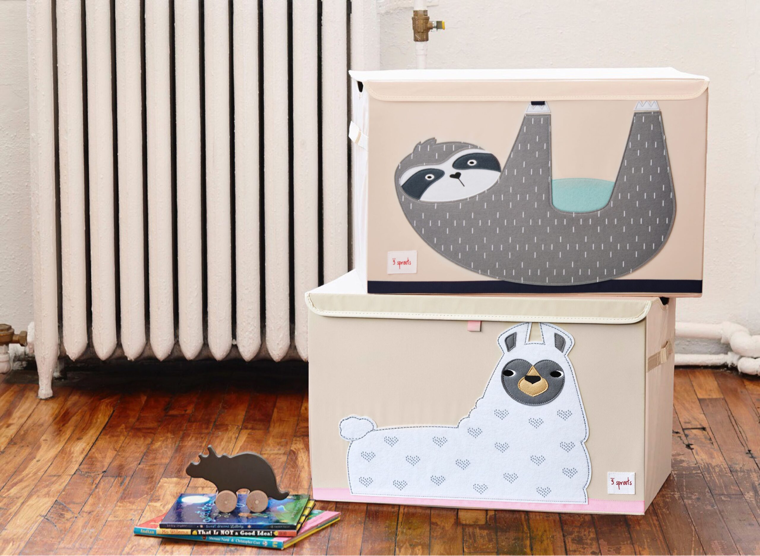 3 Sprouts -merkin säilytyslaatikko suloisella laaman kuvalla. Tämä upea lelulaatikko on vuorattu polyesteri-kankaalla.