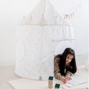 Kaunis ja kevyt leikkiteltta, jossa on teräväkärkinen katto viireineen, kaksi verkkoikkunaa sekä rullattava ovi, joka kiinnittyy nauhoilla. Teltta on helppo koota ja siirtää huoneesta toiseen. Valmistettu kestävästä, kierrätetystä polyesteristä; tukevat lasikuitutolpat pitävät muodon. Mukana säilytyspussi taitettua telttaa varten. Ei sovellu alle 3-vuotiaille.
