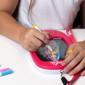 Kannettava ja ”huipputekninen” Barbie-piirtotaulu tarjoaa lapselle luovia hetkiä missä tahansa. Hihnan ansiosta sitä on helppo kantaa mukana, ja piirtäminen onnistuu helposti mukana tulevilla taikamerkeillä. Kun lapsi on saanut kuvan valmiiksi, etuosan sydänpainike sytyttää sen upeasti hohtamaan – tuloksena maaginen, itsevalaiseva Barbie-kuva.