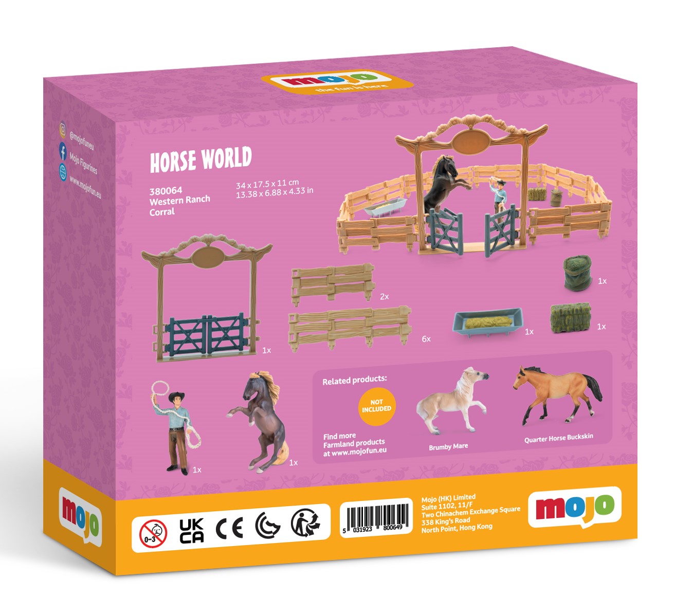Realistinen muotoilu ja laadukas, ftalaatiton muovimateriaali tekevät setistä turvallisen ja kestävän. Se yhdistyy helposti muihin Mojo-figuureihin ja tarvikkeisiin, jolloin ranchi ja tarinat kasvavat lapsen mukana.