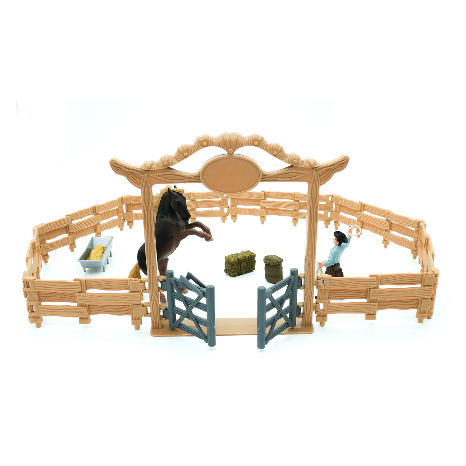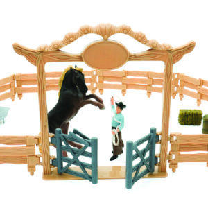 Sisältää cowboyn, hevosen, portillisen sisäänkäynnin, 8 aitaa, ruokintakaukalon, olkipaaliin ja kaurasangon
