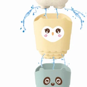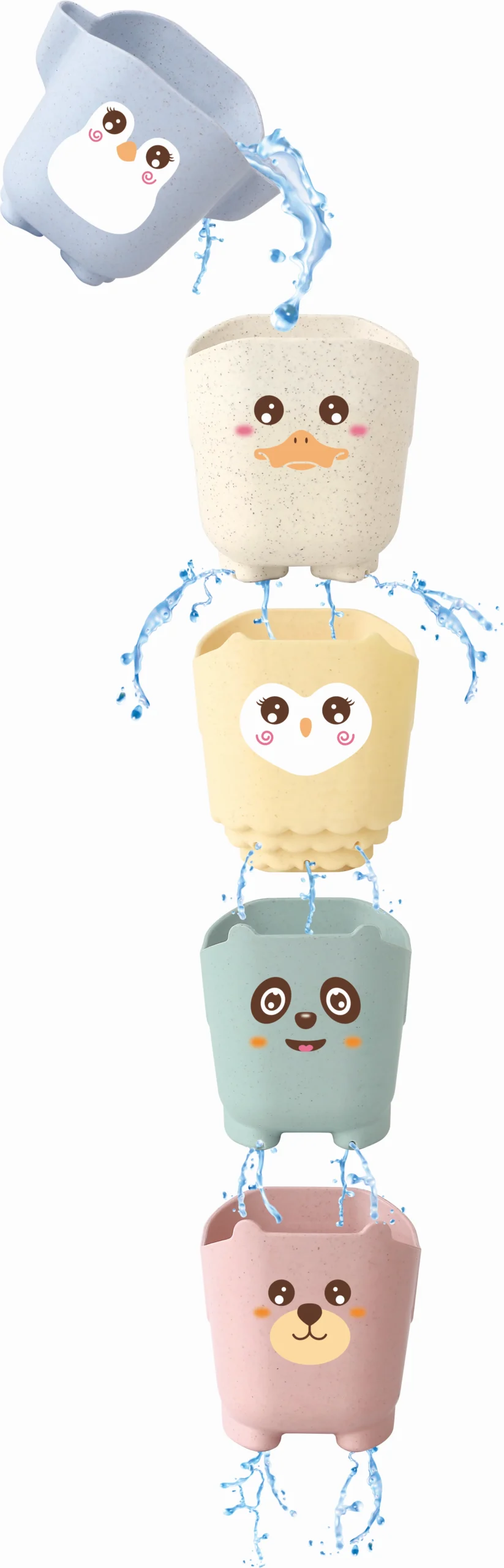 Suloinen viiden mukin setti, joka tekee kylpy- ja vesileikeistä entistä hauskempia! Mukit ovat pingviinin, ankan, pöllön, pandan ja karhun muotoisia, ja niiden pohjassa on reiät veden valuttamista varten. Mukien mukana tulee imukupit, joilla ne voi ripustaa toistensa alle ja luoda kauniin vesiputouksen kylpyammeeseen.