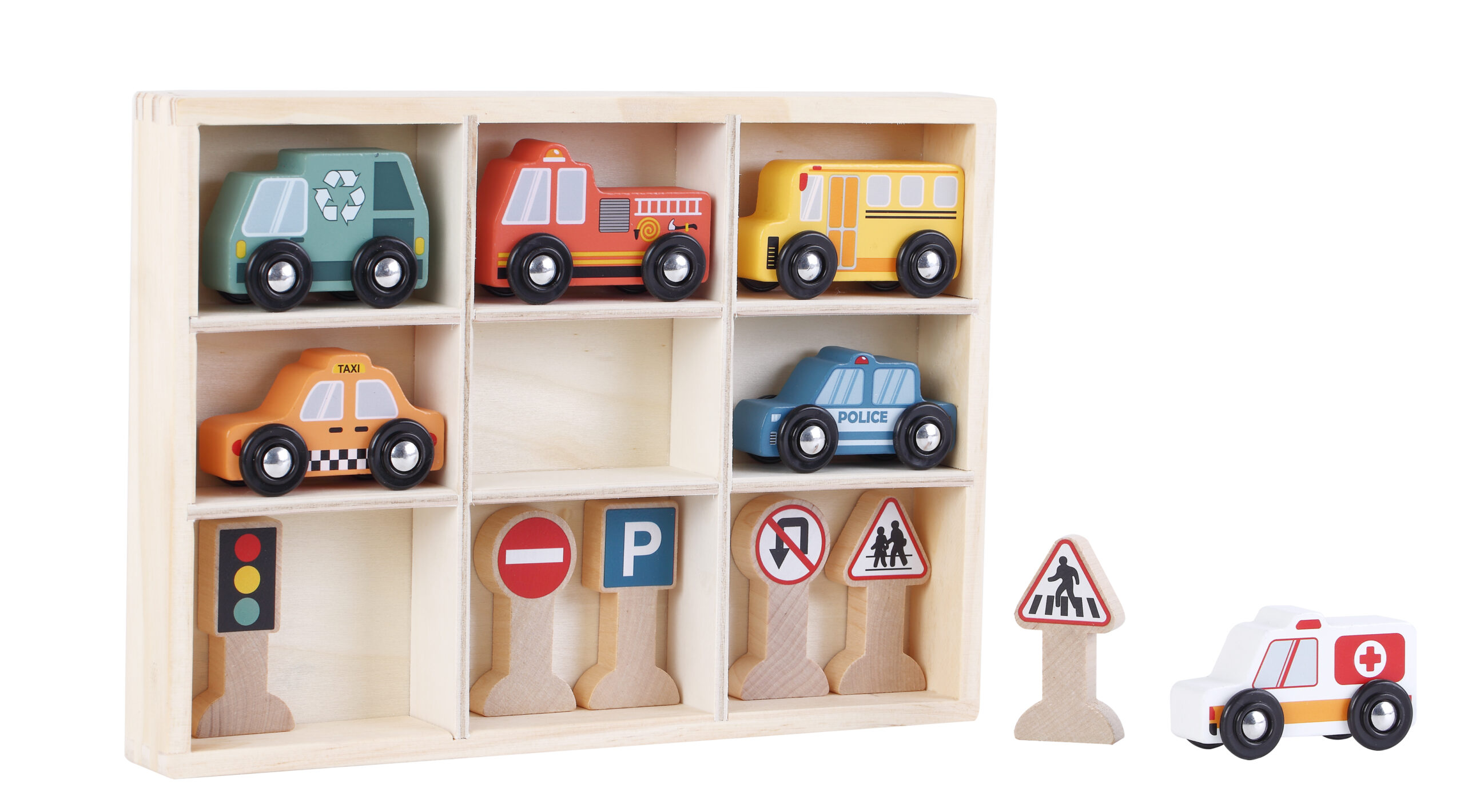 tuotteesta Kinder and Kids Puinen laatikko, jossa liikennemerkkejä ja ajoneuvoja puusta, 12 kpl.