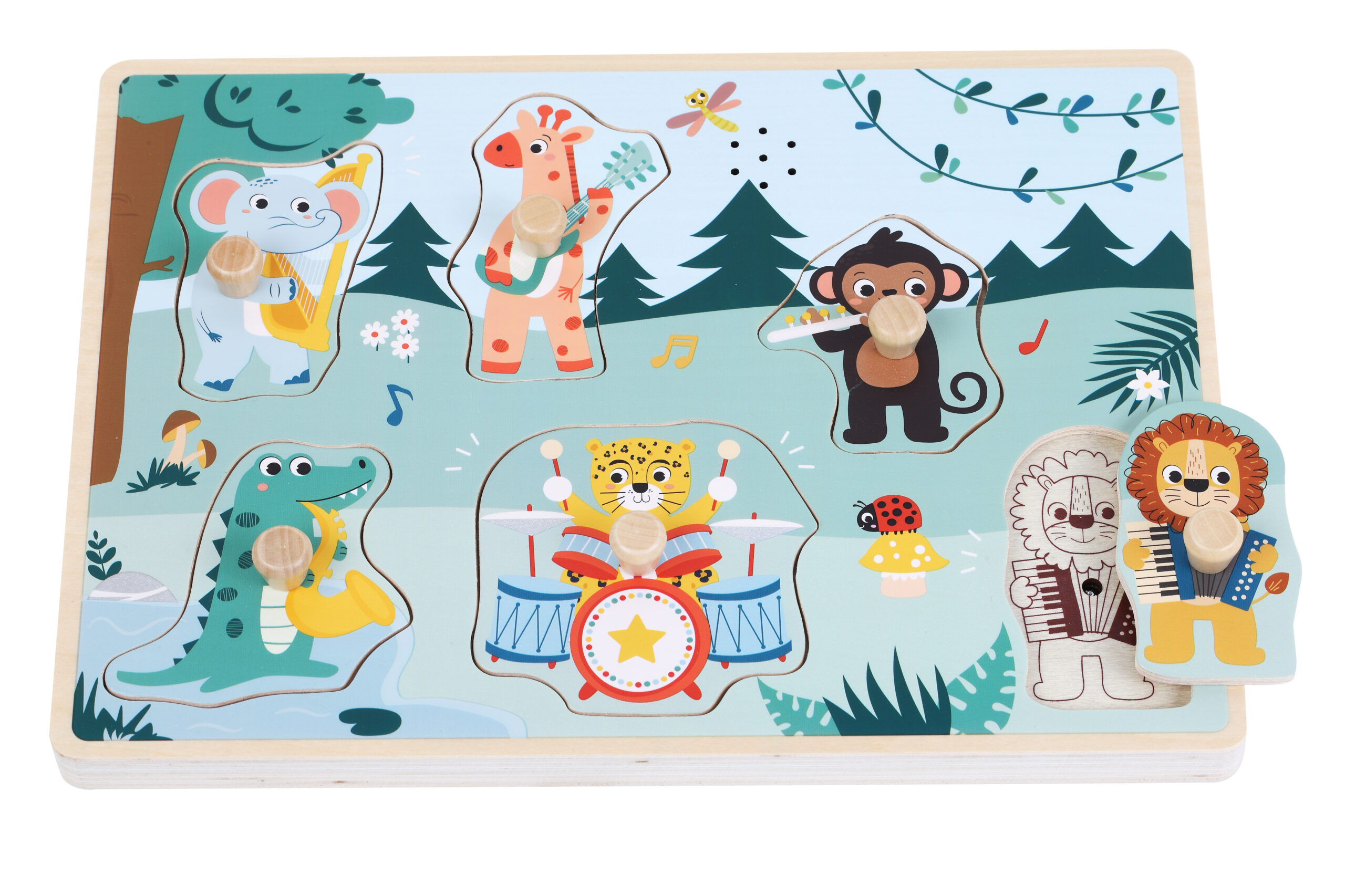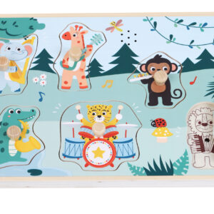 Iloinen nuppipalapeli, jossa on 6 helposti tartuttavaa palasta. Jokaisen palan alla on sama eläin ja soitin kuin palassa, ja kun pala asetetaan oikeaan kohtaan, eläin ”soittaa” instrumenttiaan. Leikin lomassa harjaantuvat keskittyminen, hienomotoriikka sekä käden ja silmän koordinaatio.