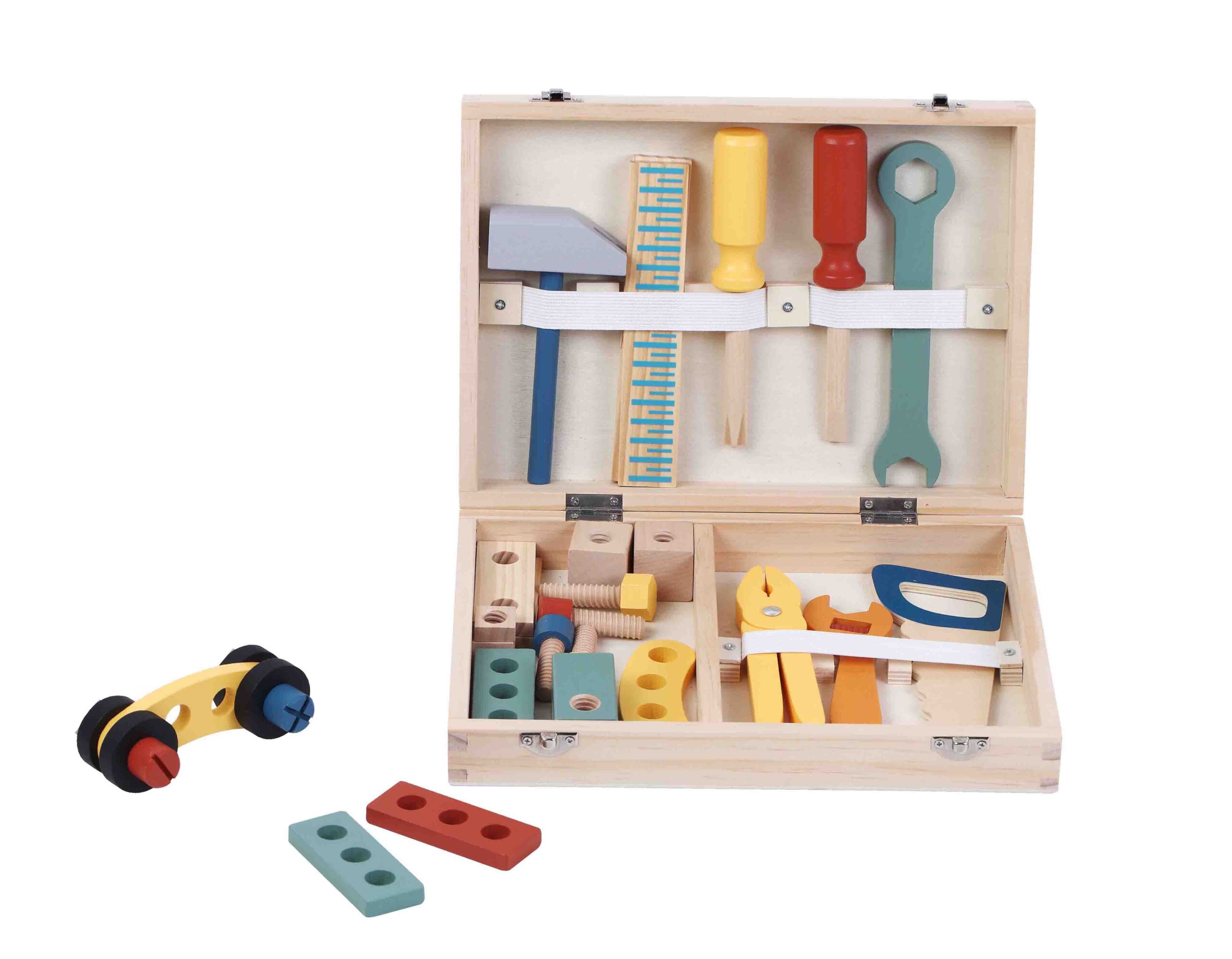 Hauska ja opettavainen puinen työkalulaatikko, jossa on kaikki pienelle rakentajalle tarpeellinen. Mukana 8 erilaista työkalua sekä ruuveja, muttereita ja rakennuspaloja, joita voi kiinnittää yhteen. Kuminauhat pitävät työkalut järjestyksessä kuljetuksen aikana.
