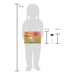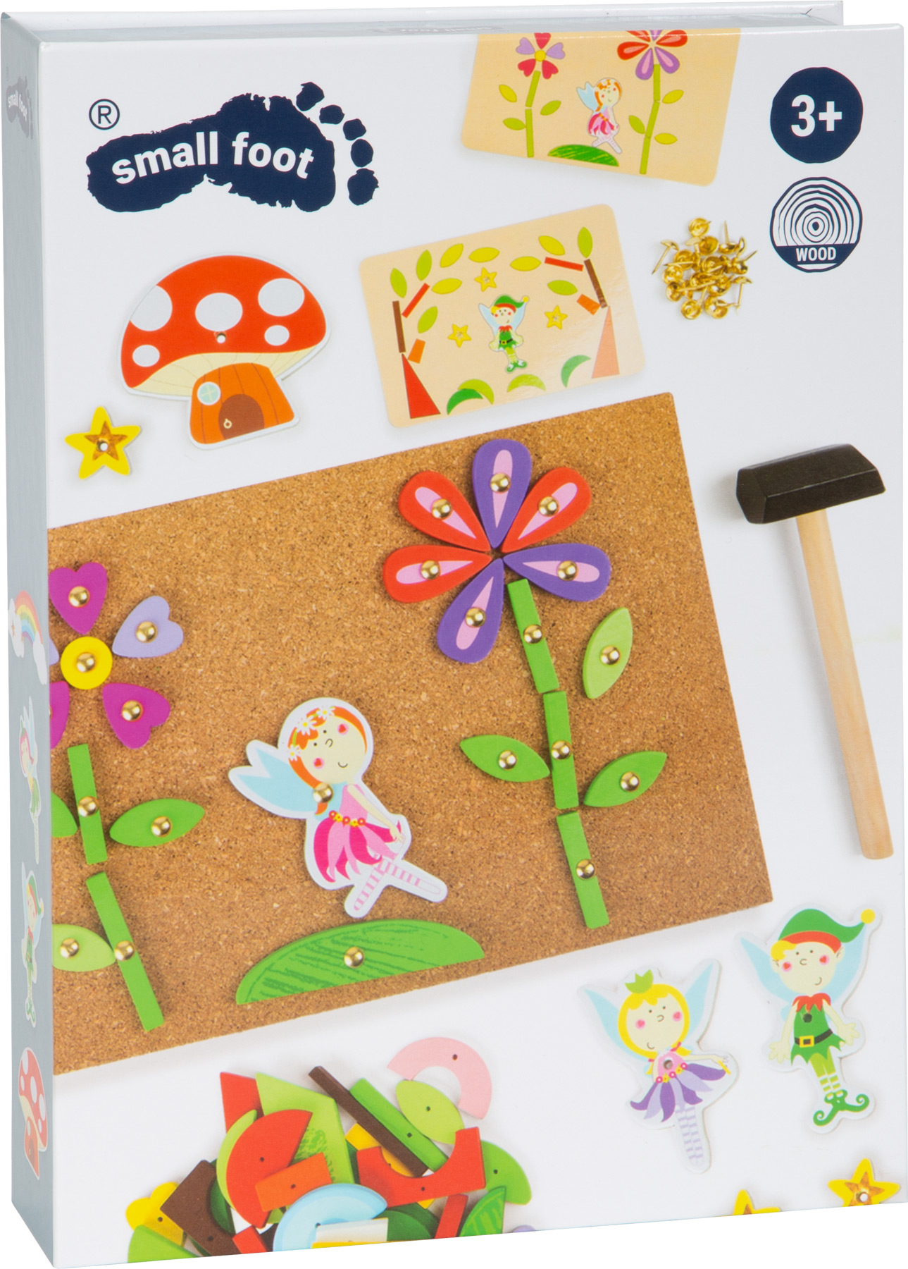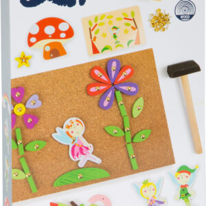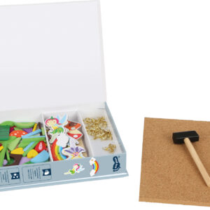 Tämä ihastuttava naulaussetti vie lapsen satujen ja mielikuvituksen maailmaan! Lapsi voi sommitella ja kiinnittää erilaisia satuhahmoja ja kuvioita korkkialustalle mukana tulevilla metallinastoilla ja pienellä vasaralla. Neljä mallikorttia antavat ideoita kuvien rakentamiseen, mutta luovuus saa kukkia – lapsi voi keksiä myös omia satukohtauksiaan ja taideteoksiaan.