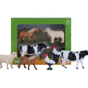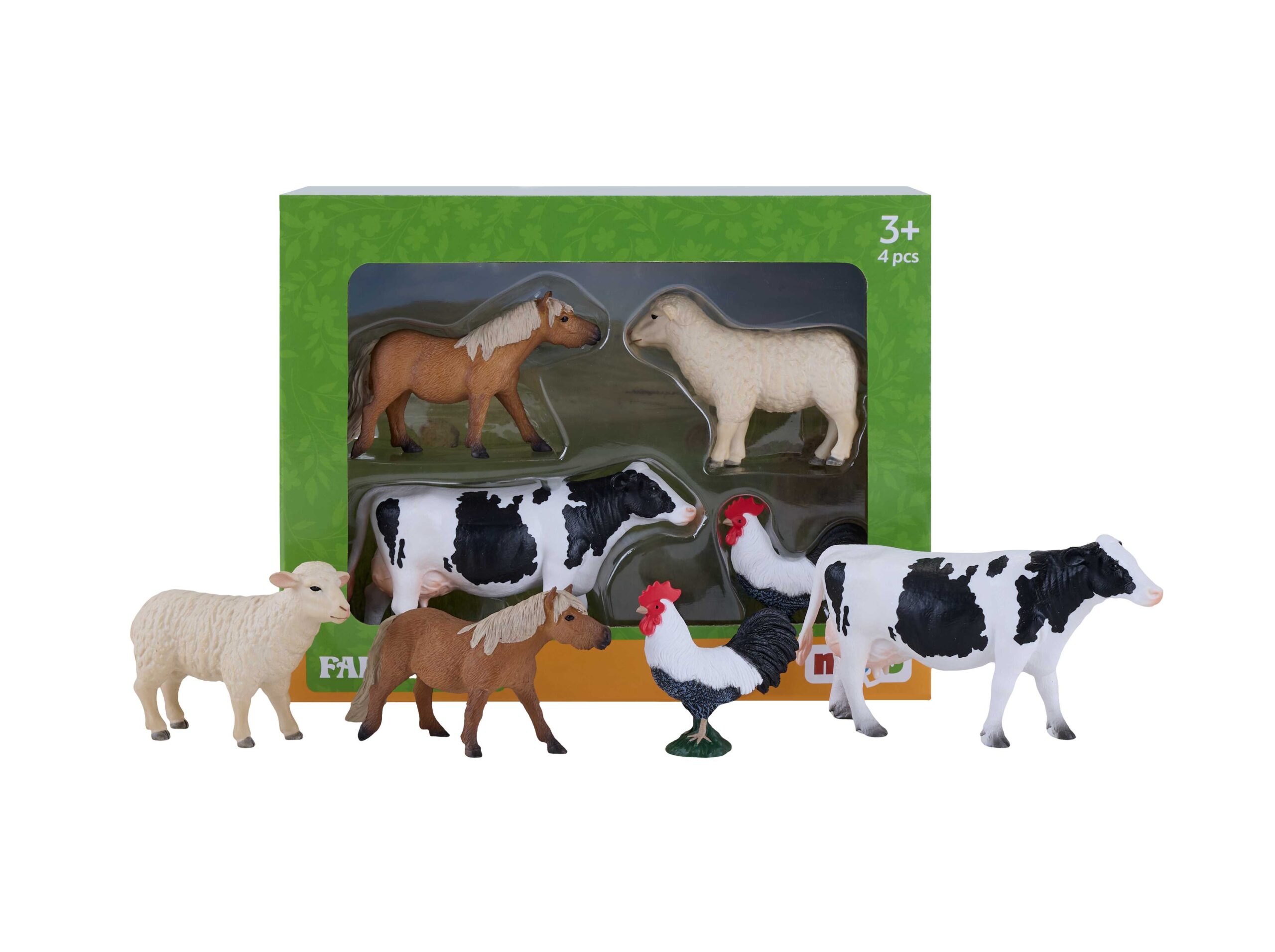 Sisältää 4 eläintä: poni, lehmä, kukko ja lammas