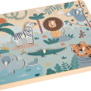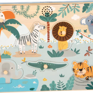 Tämä FSC® 100% -sertifioidusta puusta valmistettu, värikkäästi kuvitettu palapeli vie lapset safarille – oikeiden eläinäänien kera. Kun 7 helppotartuista palaa nostetaan pois kolostaan, kuuluu vastaava ääni, joka palkitsee oivalluksesta ja houkuttelee jatkamaan. Leikin lomassa kehittyvät hienomotoriikka, keskittyminen sekä syy–seuraus ymmärrys.