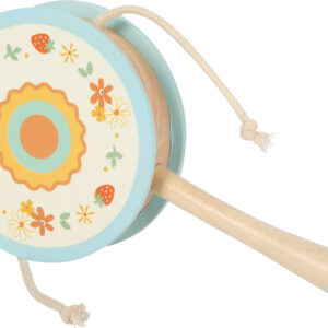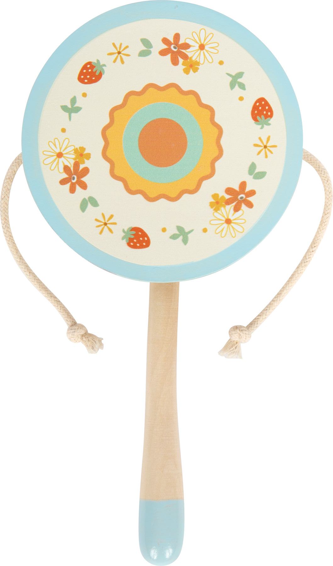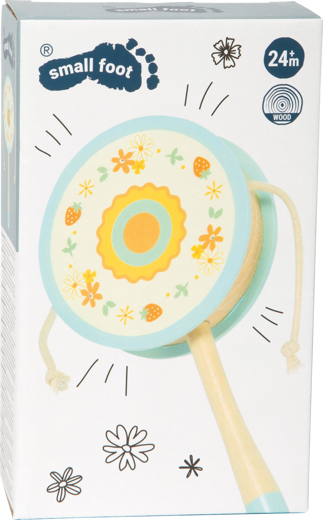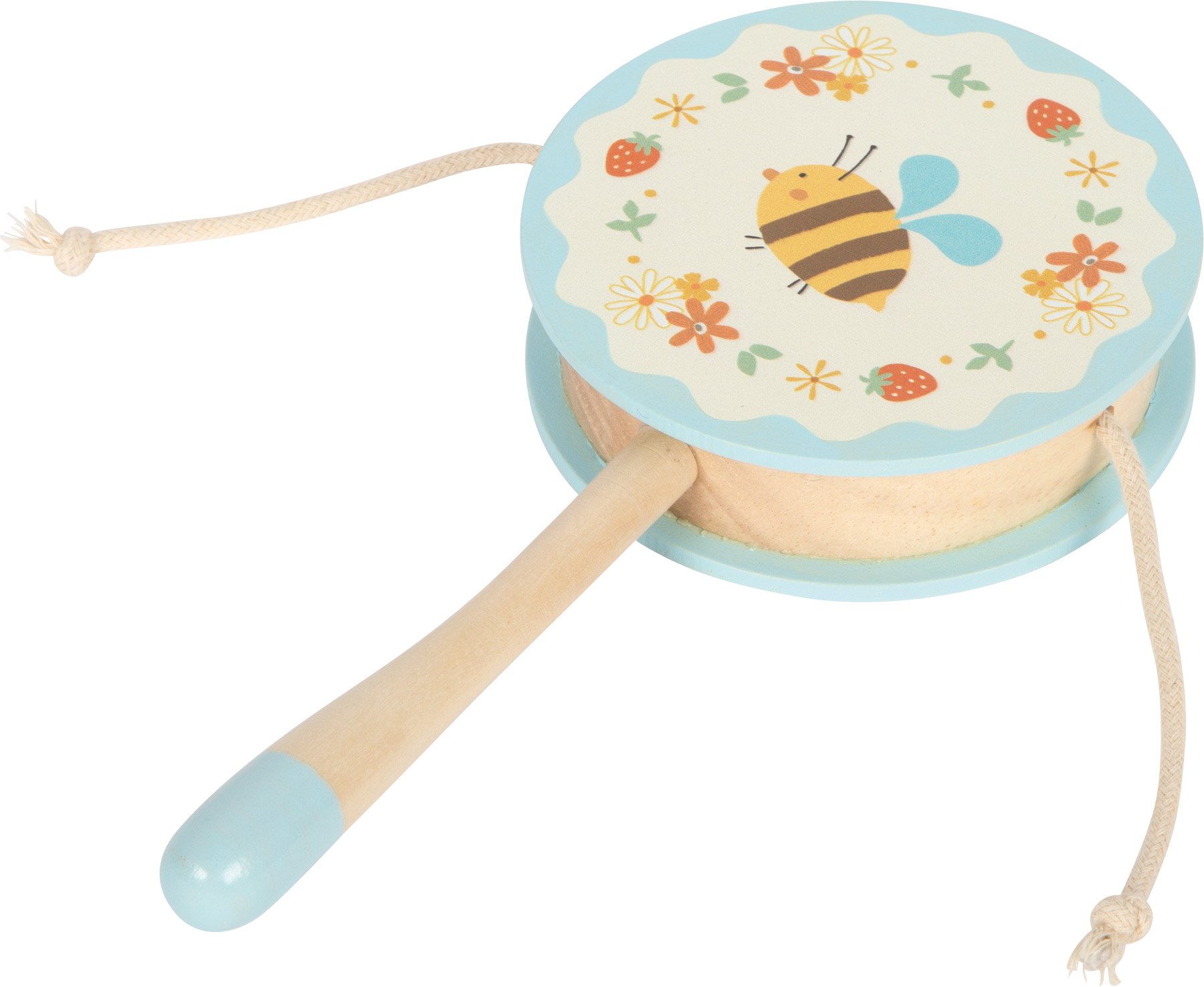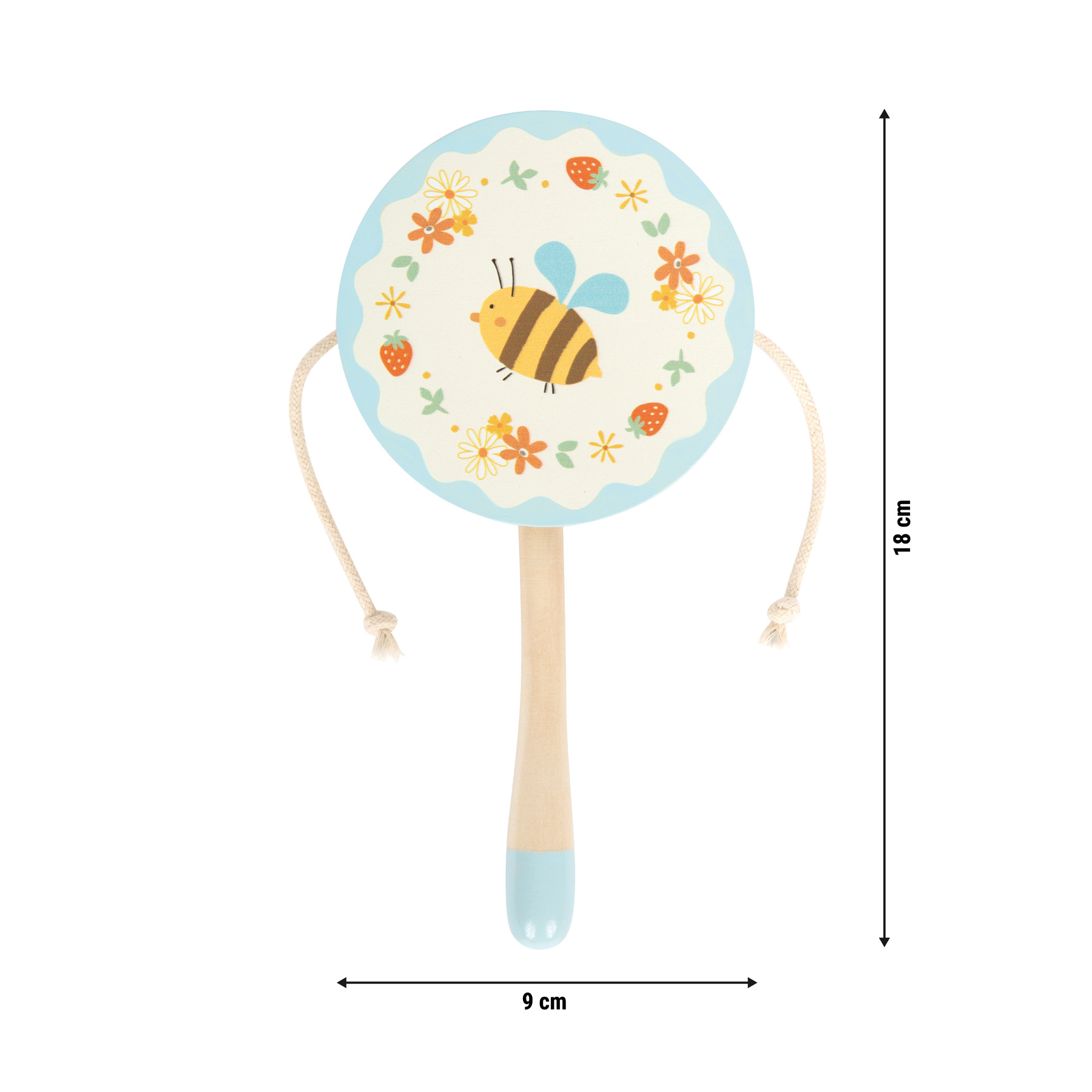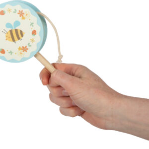 Tämä kätevä helistinrumpu kutsuu ensimmäisiin musiikkikokemuksiin ja kehittää samalla silmä–käsi-koordinaatiota. Puinen varsi tekee otteesta varman, ja rumpukalvojen molemmin puolin heiluvat solmupallot osuvat vuorotellen pintoihin, kun rumpua pyörittää käsissä. Iloinen kukka- ja mehiläiskuviointi innostaa tutkimaan ja kokeilemaan rytmejä turvallisen tuntuisesti – kotona ja matkalla.