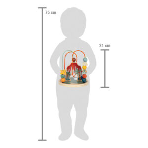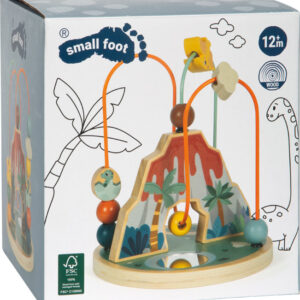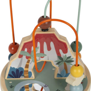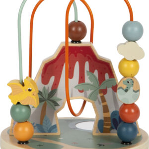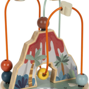 Tämä FSC® 100 % sertifioidusta puusta valmistettu lelu tarjoaa pitkäkestoista viihdettä puuhelmiensä ja kahden liukuvan palansa ansiosta, joissa on dinosauruskuvituksia. Palat liukuvat kahden toisiinsa kietoutuneen metalliradan päällä. Palojen ohjaaminen kehittää hienomotorisia taitoja ja silmän ja käden koordinaatiota hauskalla tavalla. Visuaalinen kohokohta on yksityiskohtaisesti koristeltu tulivuori, joka toimii helmilabyrintin keskipisteenä. Integroitu peili tuo lisää leikkiaikaa! Pyöristetyt reunat antavat miellyttävän tuntoaistin.