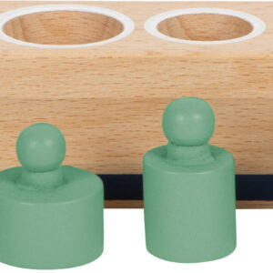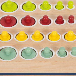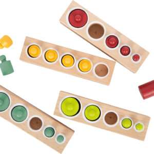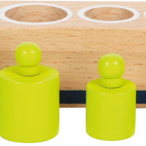 Tämä selkeä ja yksinkertainen puulelu kannustaa lasta tutkimaan, vertailemaan, laskemaan ja järjestämään. Leikki kehittää lapsen aistimuksia, hienomotoriikkaa sekä havainnointikykyä. Eri painoisten palojen tunnistaminen ja niiden järjestäminen tukee lapsen oppimista ja kasvua.