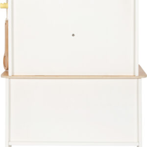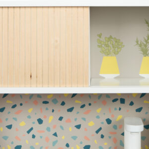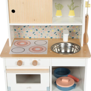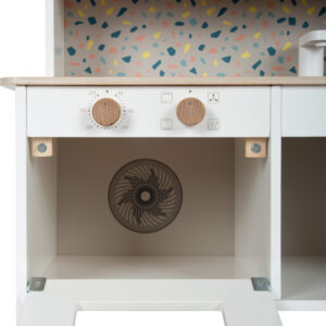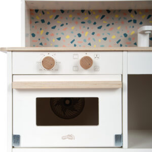 Tämä moderni, valkoinen pöytäkeittiö tuo luovan kokkailun lastenhuoneeseen kompaktissa koossa. Terrazzo-taustalevy tekee ilmeestä tyylikkään, ja kliksuvat säätimet, uuni magneettiovella sekä irrotettava metalliallas tuovat aidon keittiön tuntua. Työkorkeus noin 22 cm sopii pienille käsille – ja keittiö toimii mainiosti myös nukeille (noin 43 cm), jotta leikkikaverit pääsevät mukaan kokkaamaan.