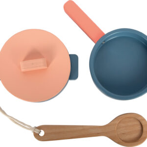Mukana paistinpannu, kattila kannella ja puinen keittolusikka