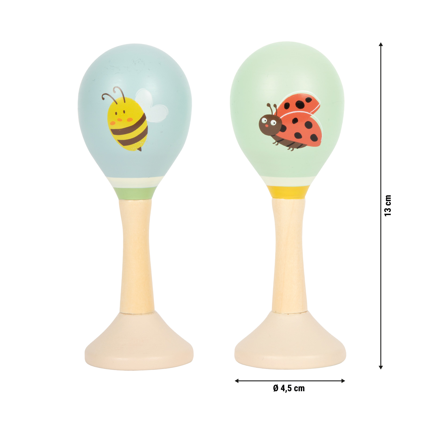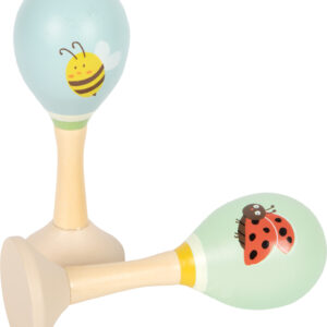 Nämä kaksi puiset marakassia tuovat iloista rytmiä leikkihetkiin ja innostavat ensimmäisiin musisointeihin. Pyöreä, lapsiystävällinen muoto istuu mukavasti pieneen käteen, ja pehmeät pastellisävyt eläinaiheineen houkuttelevat tarttumaan ja kokeilemaan. Rytmin ravistelu kehittää kuuntelua, keskittymistä ja silmä–käsi-koordinaatiota turvallisen tuntuisesti.