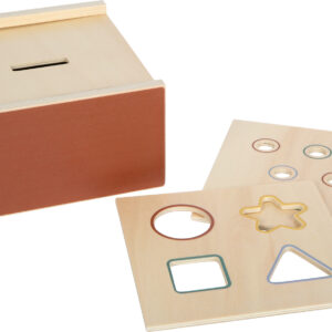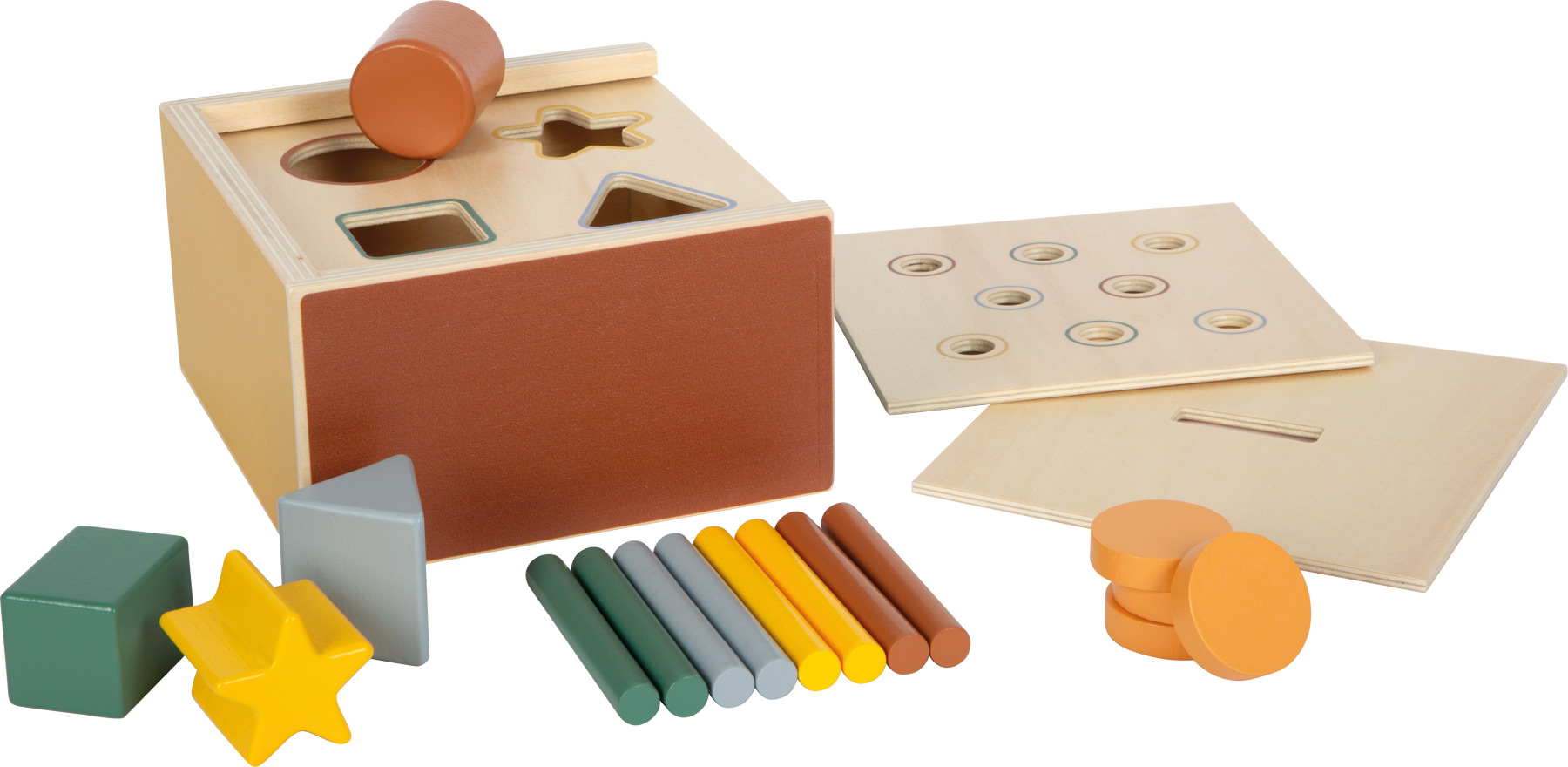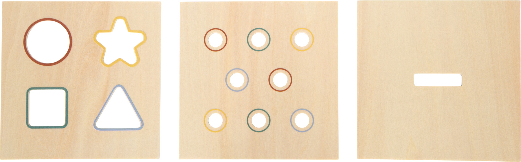 TĂ€mĂ€ FSCÂź 100% -sertifioidusta puusta valmistettu muotojenÂ- ja esineidenÂsyöttöpeli tukee pienten oppimista omatoimisen kokeilun kautta. Kolme vaihdettavaa kantta asettavat erilaista haastetta: kolikot tiputetaan aukosta, tikut pujotetaan riviin ja palikat sovitetaan geometrisiin muotoihin. SelkeĂ€ rakenne ja lempeĂ€t vĂ€rit auttavat lasta keskittymÀÀn, harjoittelemaan motoriikkaa ja ymmĂ€rtĂ€mÀÀn vĂ€rejĂ€, muotoja sekĂ€ pysyvyysperiaatetta.