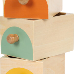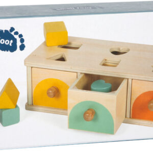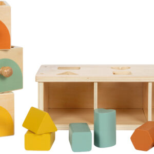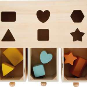 Tämä FSC® 100% -sertifioidusta puusta valmistettu lajittelupeli kutsuu tutkimaan värejä, muotoja ja järjestystä. Kolme eriväristä laatikkoa ja kuusi yhteensopivaa syöttöosaa harjoittavat tarttumista, asettelua ja päättelyä – samalla lapsi oppii esineiden pysyvyyden: palikat ovat olemassa, vaikka ne katoavat hetkeksi laatikon sisään. Pehmeät värit ja sileät reunat tekevät leikistä miellyttävää ja keskittymistä tukevaa.