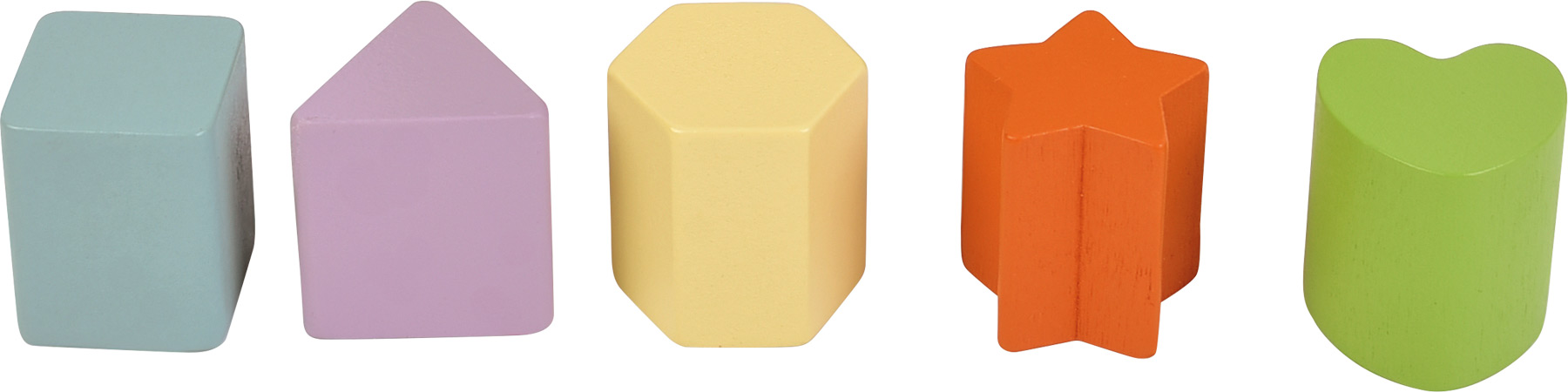 Suloinen, FSC® 100% -sertifioidusta puusta valmistettu talonmuotoinen muotosovituskuutio kutsuu harjoittelemaan väri- ja muototunnistusta. Viisi värikästä palaa ja sivuilla olevat vastaavat aukot ohjaavat sovittamaan ja tiputtamaan palikat sisään, ja sivuluukun kautta palat saa helposti ulos uutta kierrosta varten. Pehmeät sävyt, sileät reunat ja selkeät muodot tekevät leikistä turvallisen tuntuisen – katossa oleva kahva helpottaa kantamista matkalle.