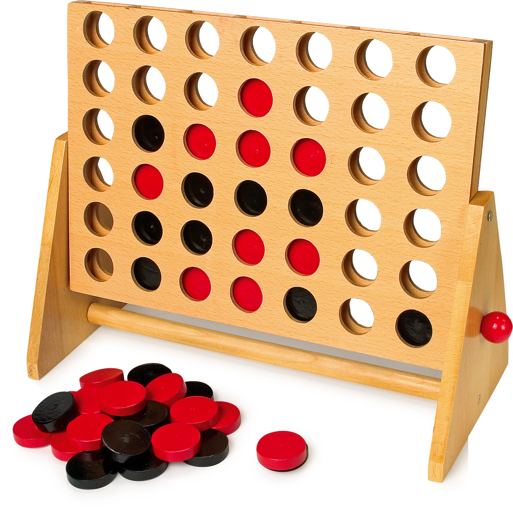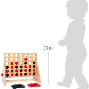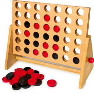 Tuttu kahden pelaajan klassikko isossa koossa koko perheen peli-iltoihin. Pelaajat pudottavat vuorotellen kiekkoja ruudukkoon ja yrittävät muodostaa neljän jonon vaaka-, pysty- tai vinoriviin. Kun peli päättyy, kehikko käännetään ylösalaisin ja kiekot putoavat ulos – uusinta voi alkaa heti.