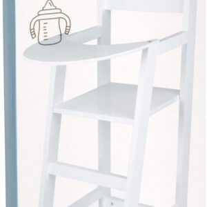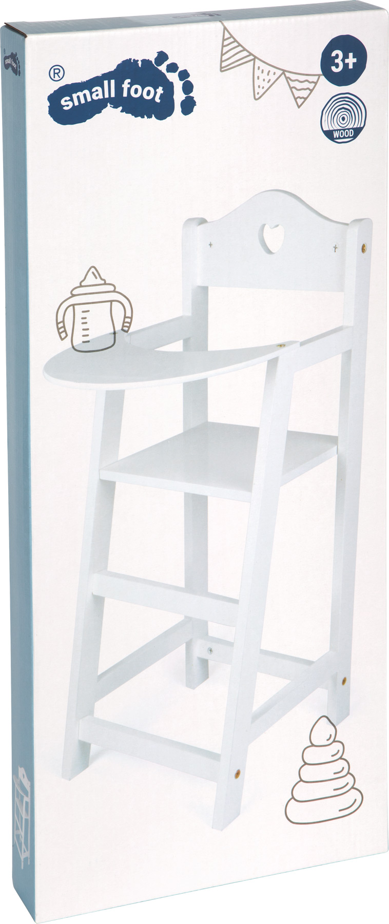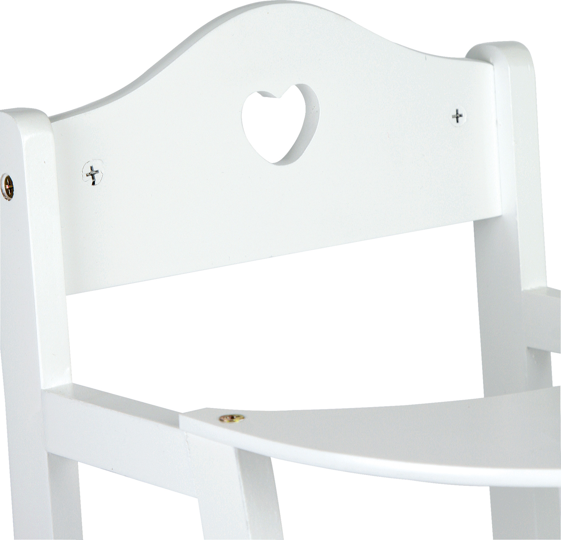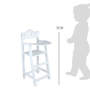 Yksinkertaisen kaunis, valkoiseksi maalattu puinen syöttötuoli kruunaa nukkejen ruokailuhetket. Pieneen sydänaukkoon viimeistelty design sulautuu luontevasti lastenhuoneeseen ja olohuoneeseen. Leikkiessään lapsi hoivaa, tarjoilee ja juttelee – arjen taidot ja empatia vahvistuvat lempeästi.