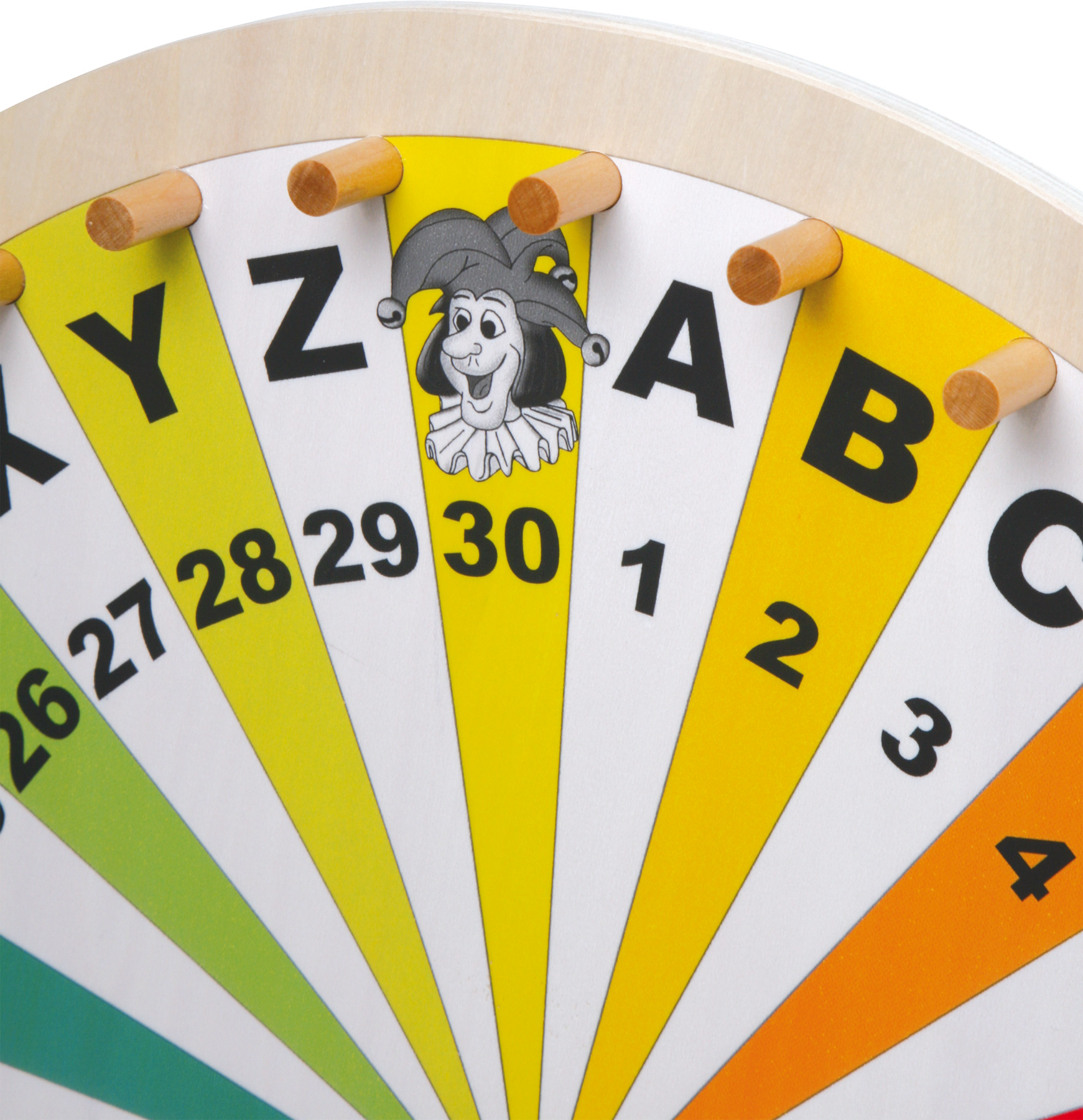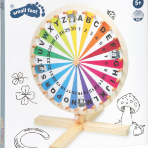 Monipuolinen onnenpyörä sopii arpajaisiin, sanapeleihin ja omiin keksittyihin kisailuihin. Sektorien merkinnöistä löytyvät numerot 1–30, kirjaimet A–Z sekä 4 jokeria. Tukeva puinen jalusta tekee pyöräyttämisestä turvallista, ja puutapit kentissä naputtavat hauskan äänen osuessaan pysäyttimeen.