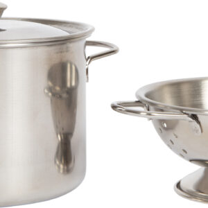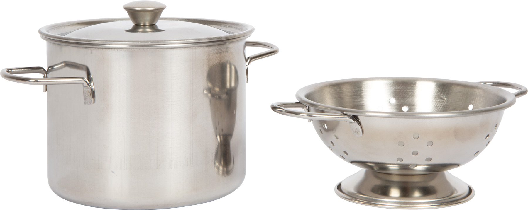 Mukana kattila kannella, metallinen siivilä, puiset lautaset ja haarukat