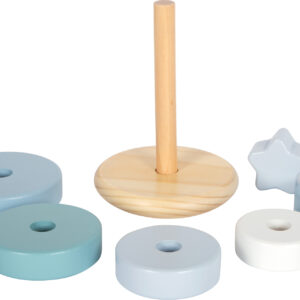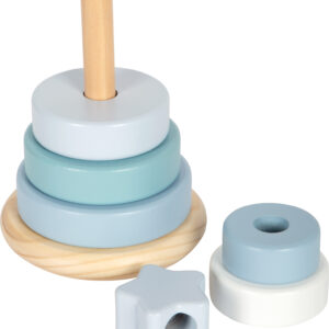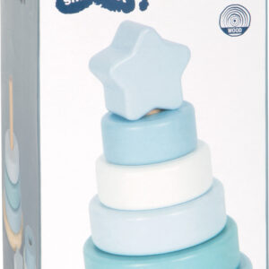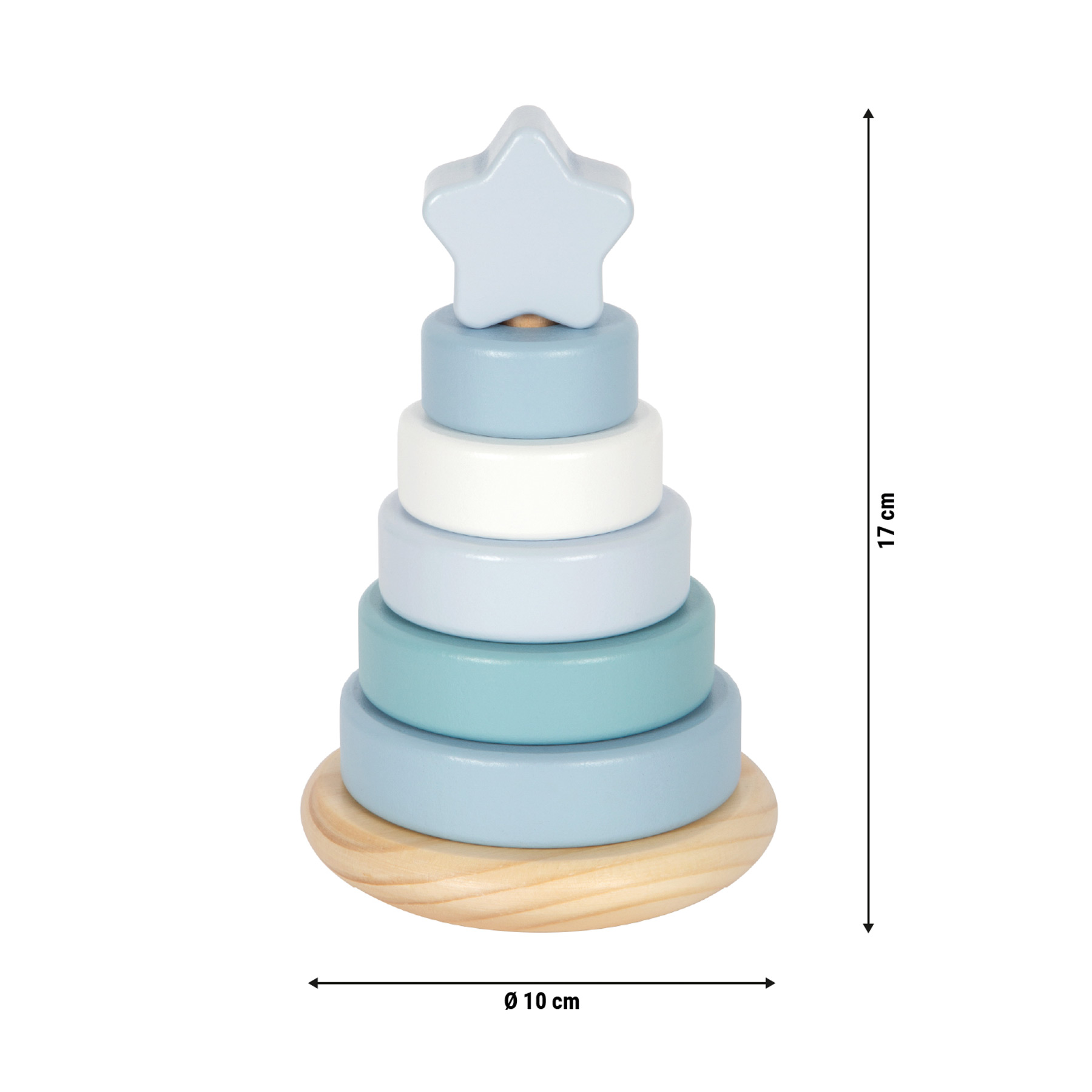 Tämä hurmaava puinen pinoamistorni on viimeistelty tähtipalalla ja rauhallisilla pastellisävyillä. Eri kokoiset renkaat kutsuvat lajitteluun ja pinoamiseen, kehittäen hienomotoriikkaa, keskittymistä sekä koko- ja värikäsitystä. Pyöristetty, kevyesti keinahteleva pohja tekee leikistä kiinnostavaa ja harjoittaa tasapainon hahmottamista – sileät, pyöristetyt reunat tuntuvat turvallisen miellyttäviltä pienissä käsissä.