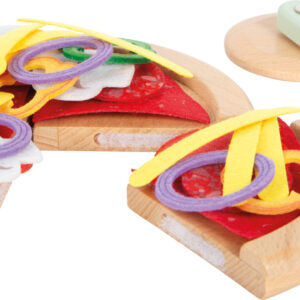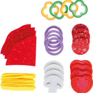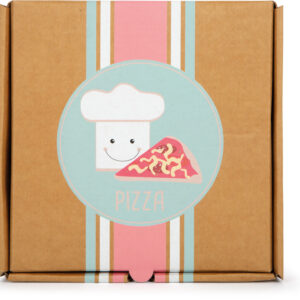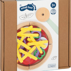 Koristeellinen, tukeva pahvinen pizzalaatikko sisältää kaiken, mitä pieni kokki tarvitsee leikisti herkulliseen pizzapäivään. Neljä puista pizzapalaa kiinnittyvät tarralla toisiinsa ja “leikataan” mukana tulevalla pyöröleikkurilla – hauskaa tekemistä, joka harjoittaa motoriikkaa. Huopaiset täytteet (sipuli, sienet, paprika, tomaatti, makkara ja juusto) sekä käännettävä tomaattikastikepohja (yrteillä tai ilman) innostavat kokeilemaan uusia makuyhdistelmiä ja yhteisiä roolileikkejä.