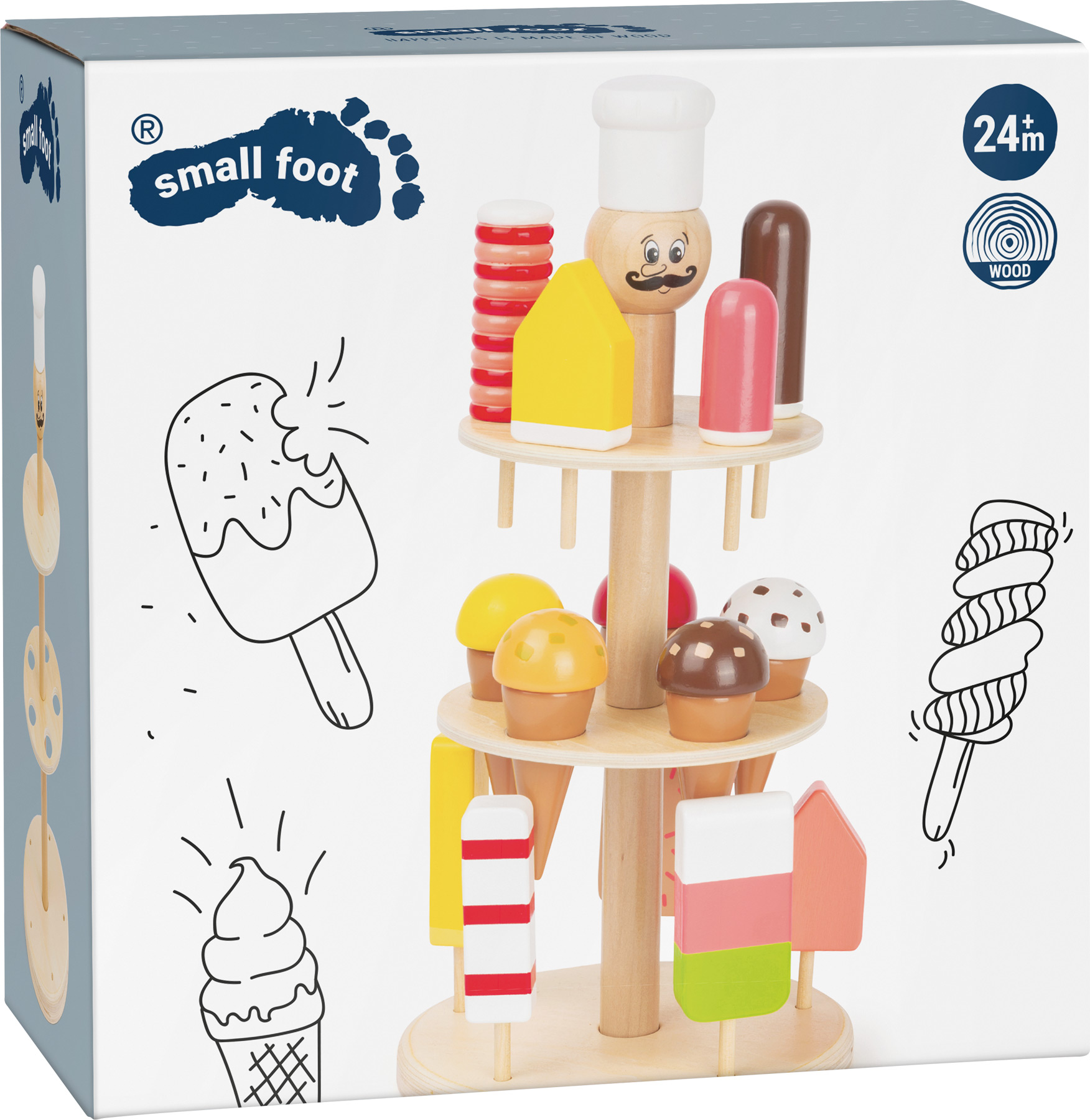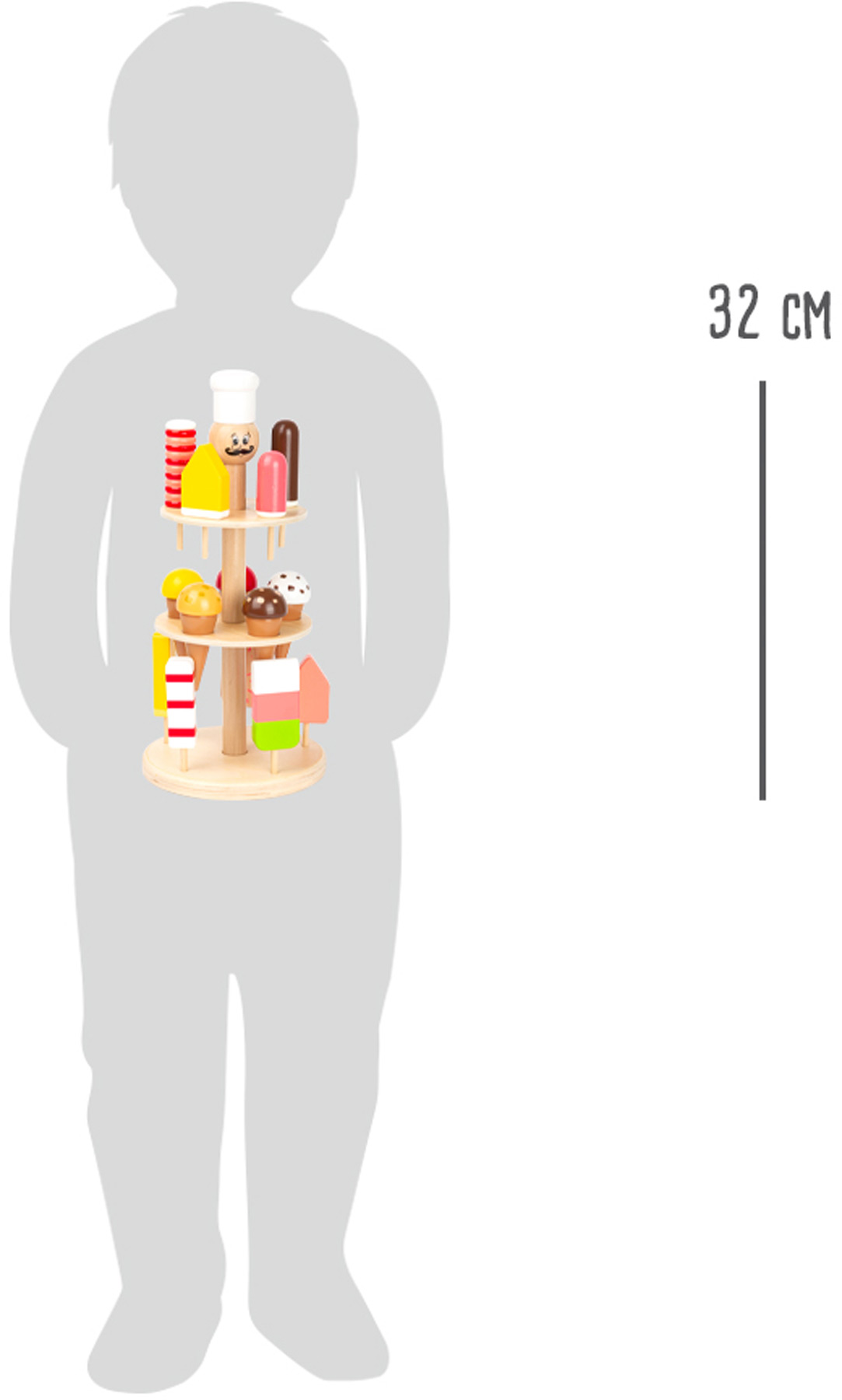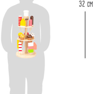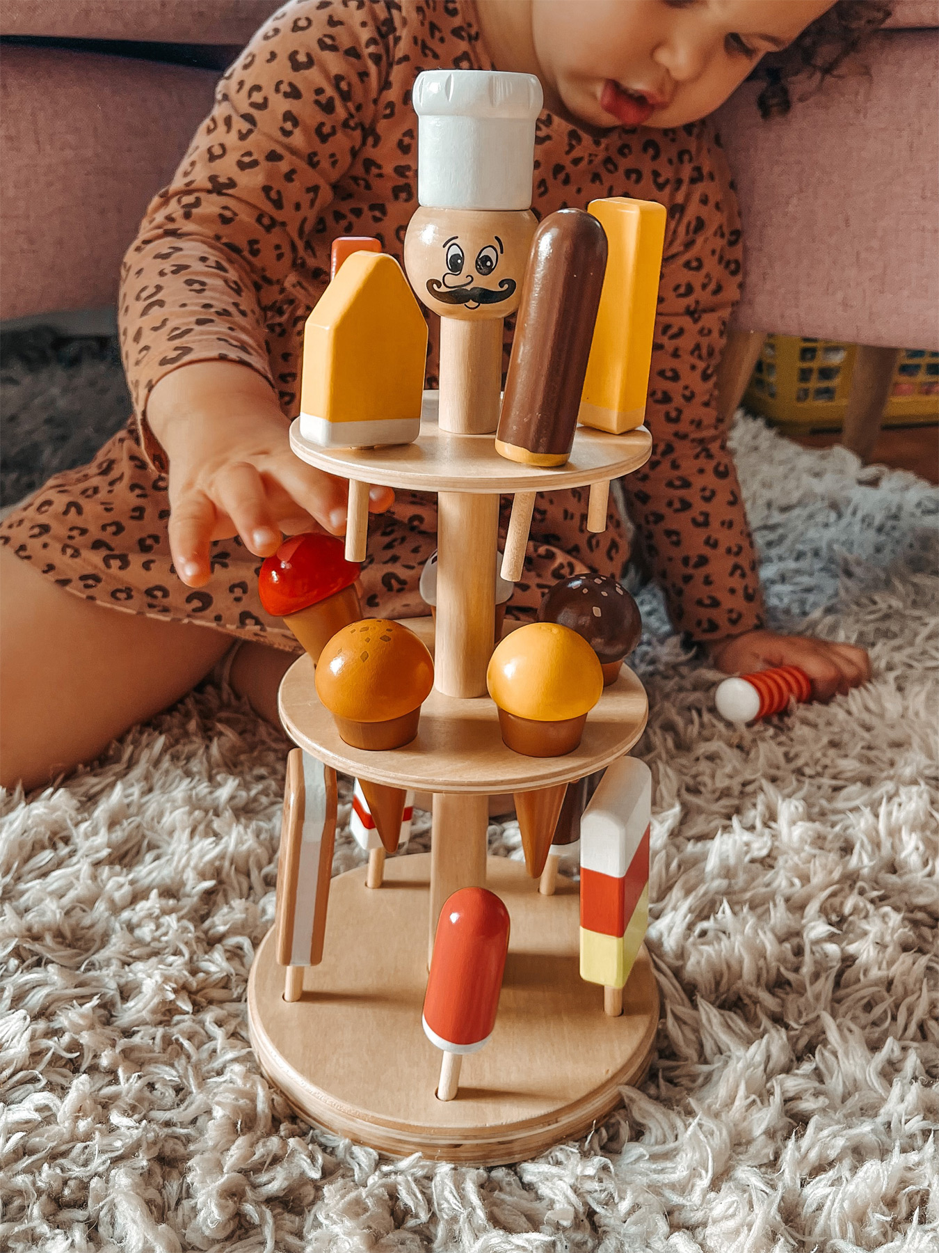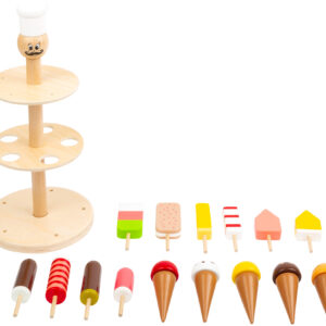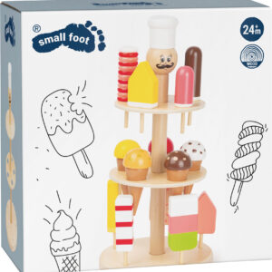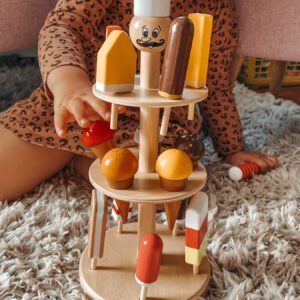 Nam, jäätelöä! Tämä suloisesti muotoiltu puinen jäätelöteline ilahduttaa kaikkia pieniä herkkusuita. Lapset voivat valita suosikkinsa eri makuisista jäätelöistä – joko tikkuna tai vohvelina – ja ripustaa ne kauniisti telineeseen. Jäätelöteline sopii täydellisesti leikkikauppaan tai jäätelöbaarileikkeihin ja tekee myyntipisteestä heti houkuttelevan. Kestävästä massiivipuusta valmistettu rakenne takaa pitkän leikki-iän ja tekee siitä erinomaisen leikkivälineen päiväkoteihin ja koteihin.