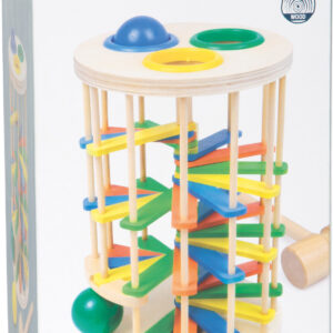 Hyvin muotoiltu puinen torni tarjoaa hauskan leikin: tipauta tai kopauta kolme värikästä puupalloa ylhäältä, ja ne rullaavat portaita alas iloisesti kolisten. Leikki kehittää hienomotoriikkaa ja silmä–käsikoordinaatiota sekä opettaa syy–seuraussuhteita – kerta toisensa jälkeen.