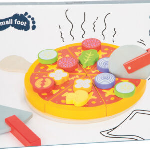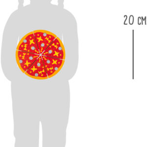 Tämän lelun avulla lapsi voi rakentaa pizzansa itse – erilaiset täytteet kiinnittyvät helposti tarroilla ja pizzasta voi tehdä juuri sellaisen kuin haluaa. Kun pizza on valmis, se voidaan tarjoilla puisella tarjoilualustalla ja pizzalapiolla.