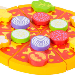 Tällä leikattavalla pizzasetillä jokainen lapsi pääsee kokiksi ja tarjoilijaksi! Puinen pizza koostuu kuudesta viipaleesta, jotka ovat kiinni toisissaan tarrapaloilla (Velcro). Ne voi leikata erilleen mukana tulevalla pizzaleikkurilla, jotta jokainen “vieras” saa oman palansa.