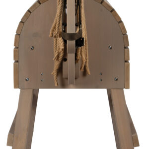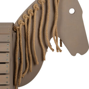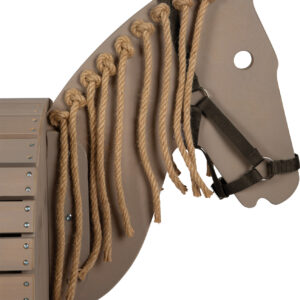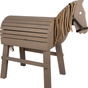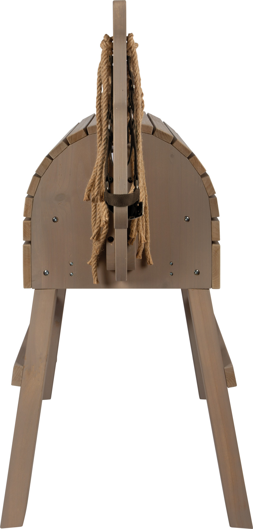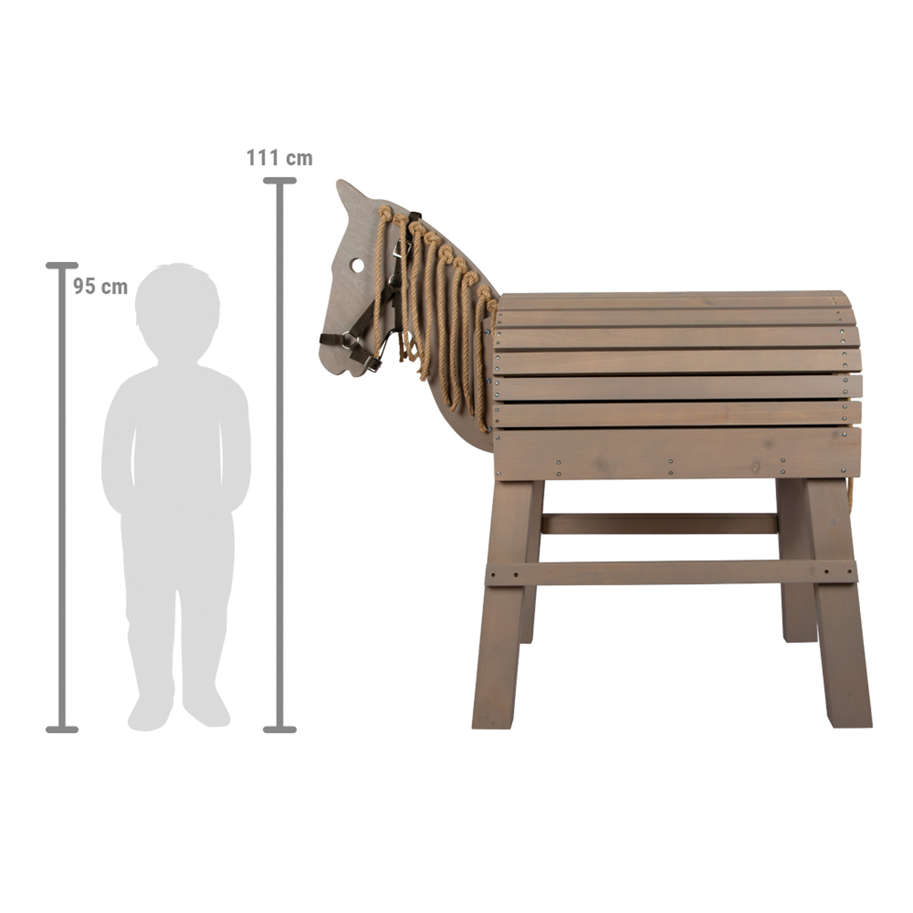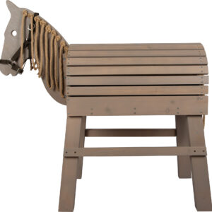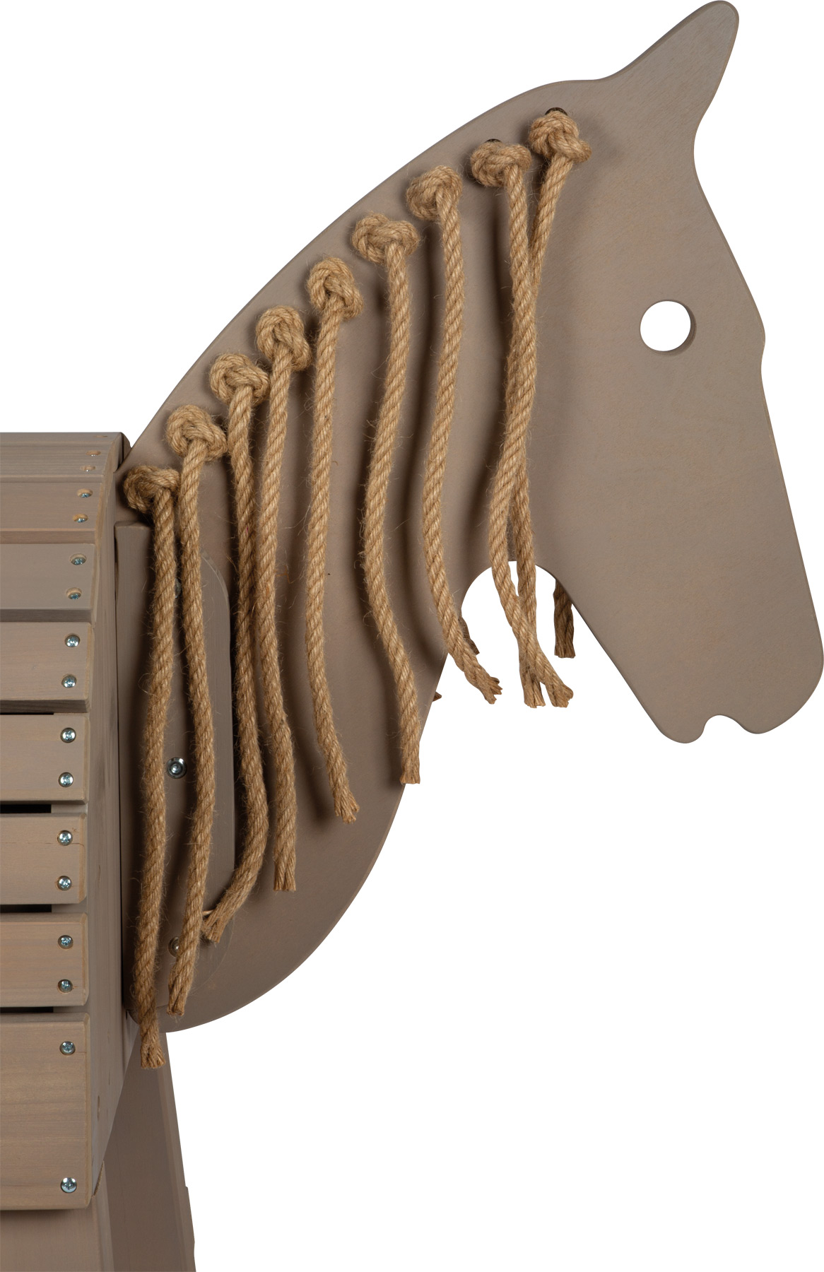 Suurikokoinen, säänkestävällä harmaalla maalilla käsitelty puuhevonen kutsuu leikkimään, ratsastamaan ja harjoittelemaan. Tukeva rakenne ja leveä jalkojen asento pitävät hevosen vakaasti paikallaan, ja käytännöllinen nousuaskel helpottaa selkään pääsyä myös pienemmille. Kestävästi tehty harja ja häntä houkuttelevat letittämään ja hoitamaan, ja selkä on muotoiltu sopimaan oikealle satulalle ja istuintyynylle. Takana olevaan saranoituun luukkuun kätkeytyy reilu säilytystila varusteille – suitsi sisältyy pakkaukseen.