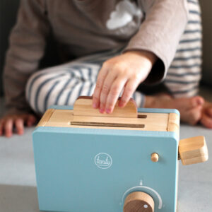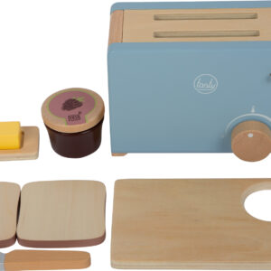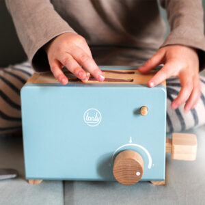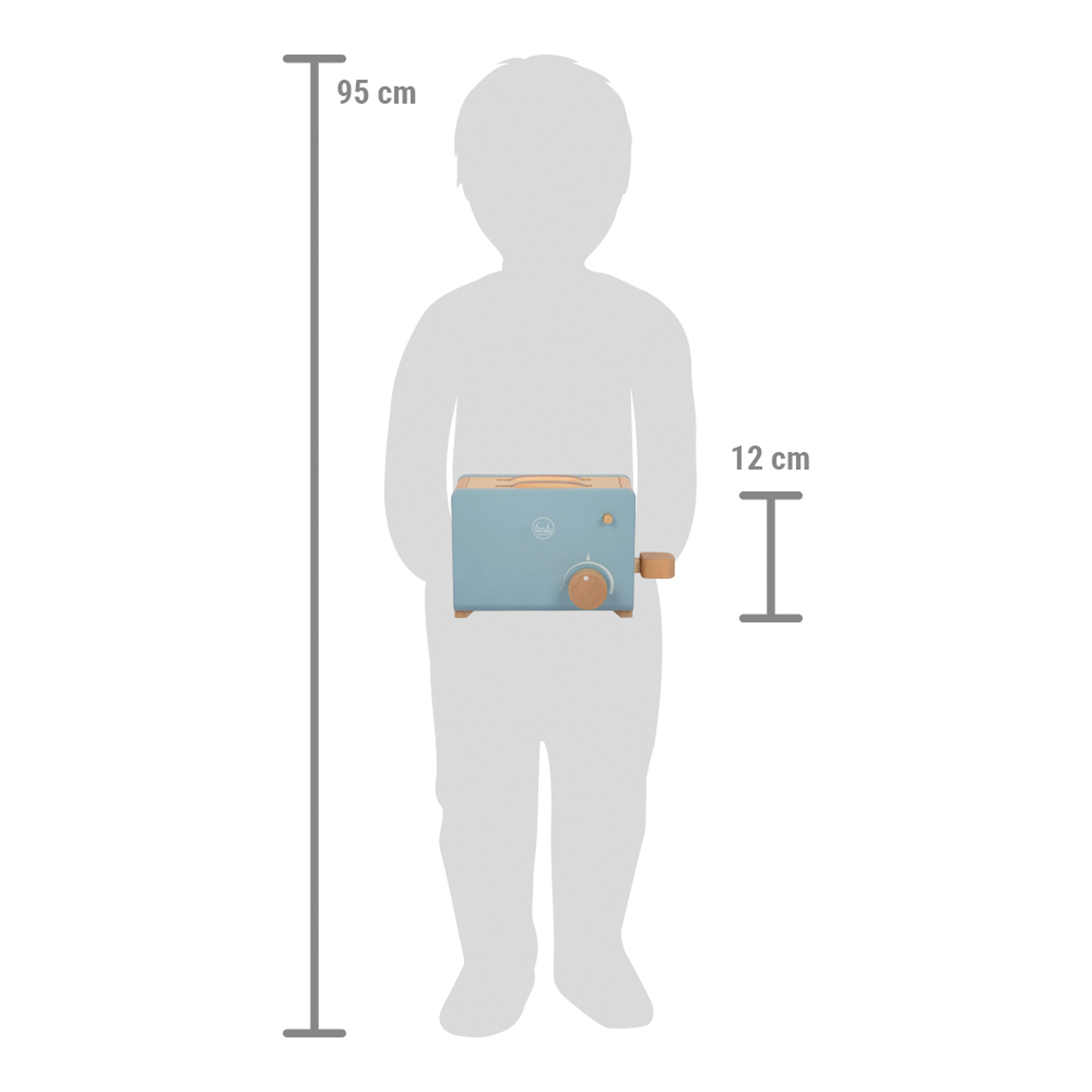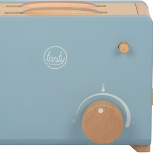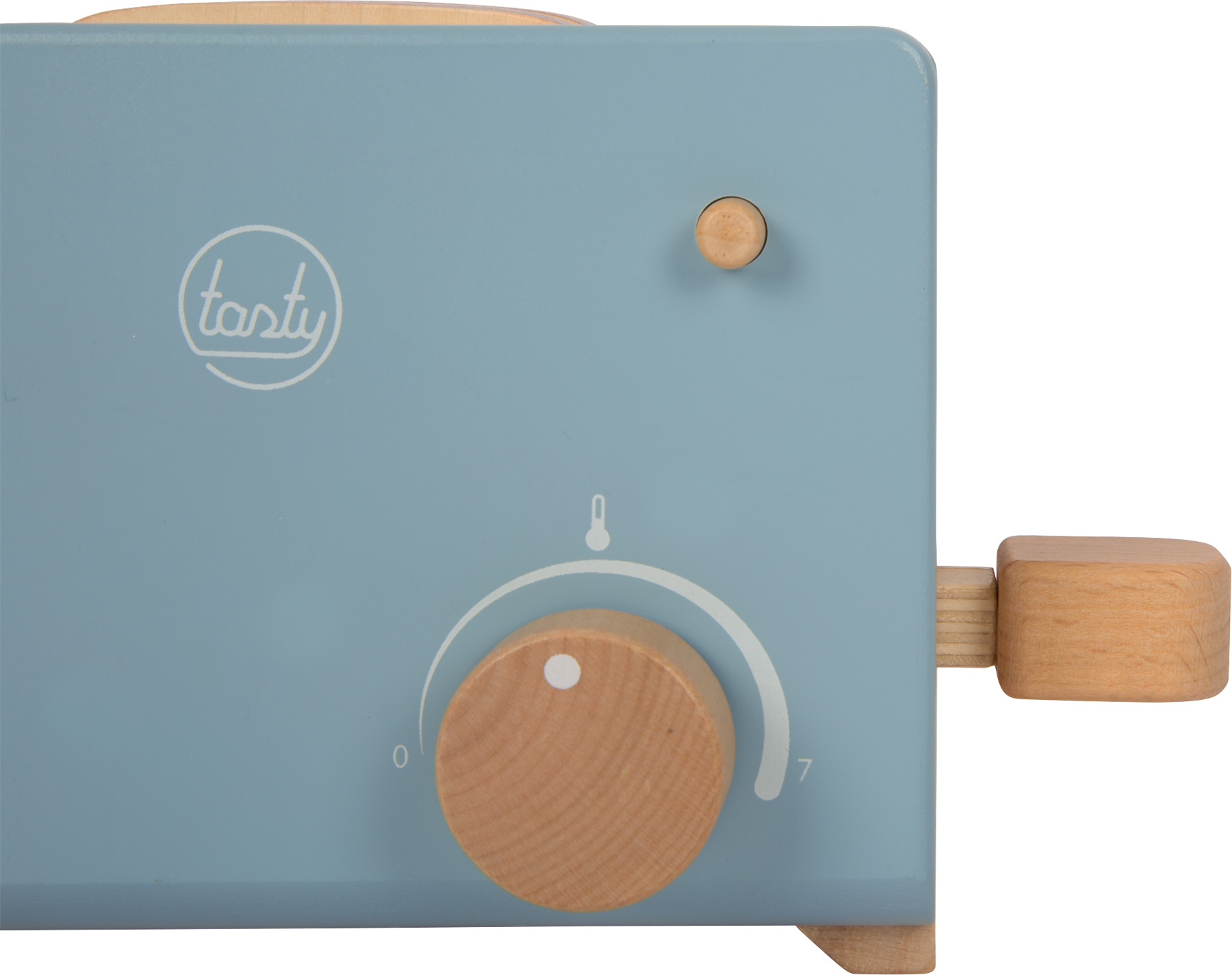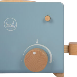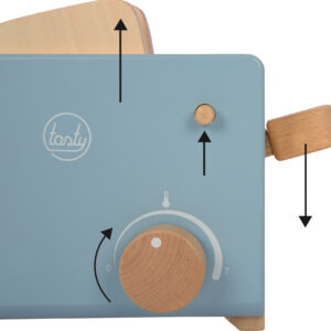 Aamiaisen aika! Tämä puinen leivänpaahdin ja sen tarvikkeet tekevät jokaisesta leikkiaamiaisesta täydellisen hetken. Tyylikkäässä savunsinisessä, valkoisessa ja luonnonpuun sävyisessä designissa yhdistyvät moderni ulkonäkö ja aidontuntuinen toiminnallisuus, joka hurmaa pienet keittiömestarit.