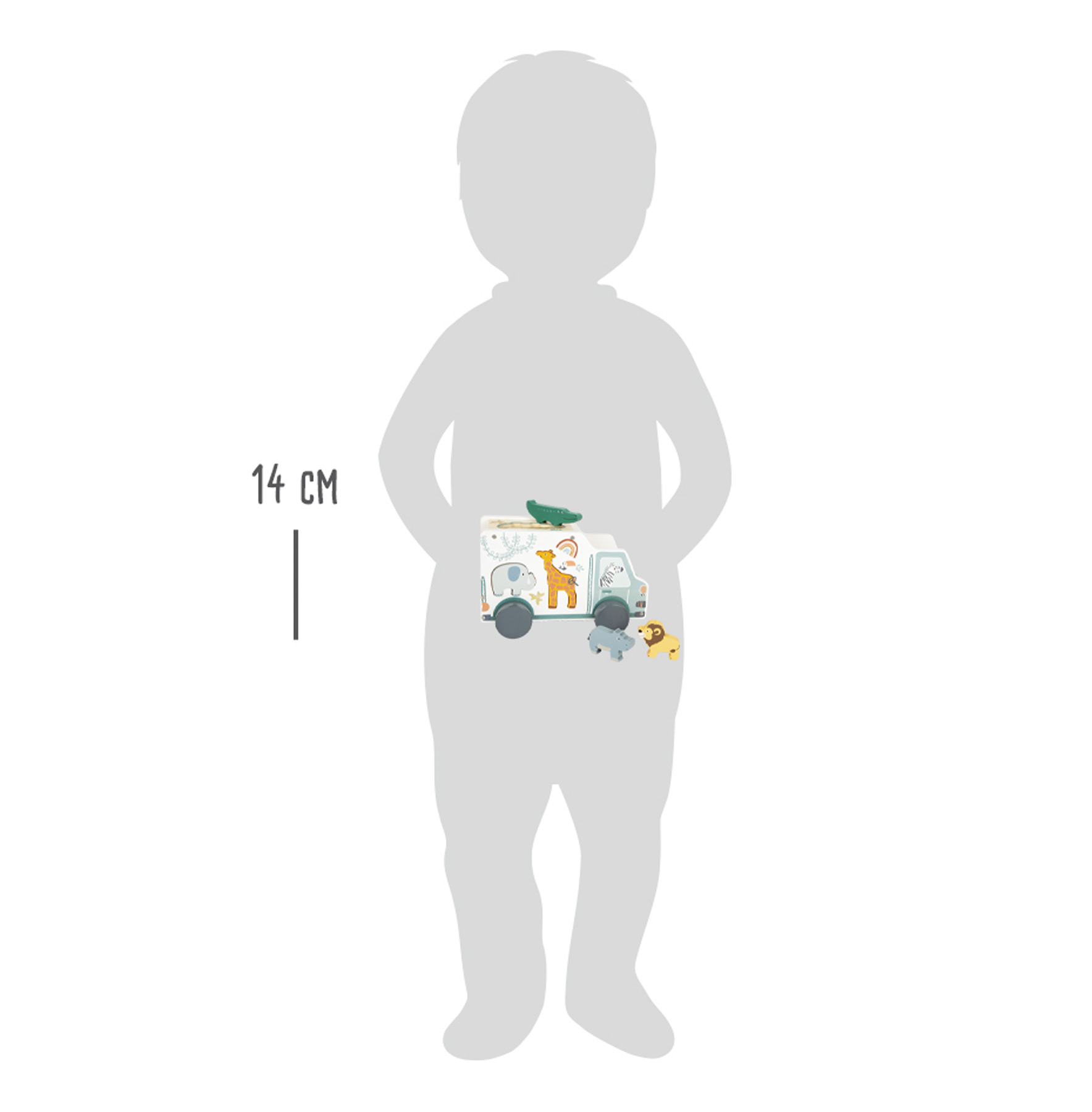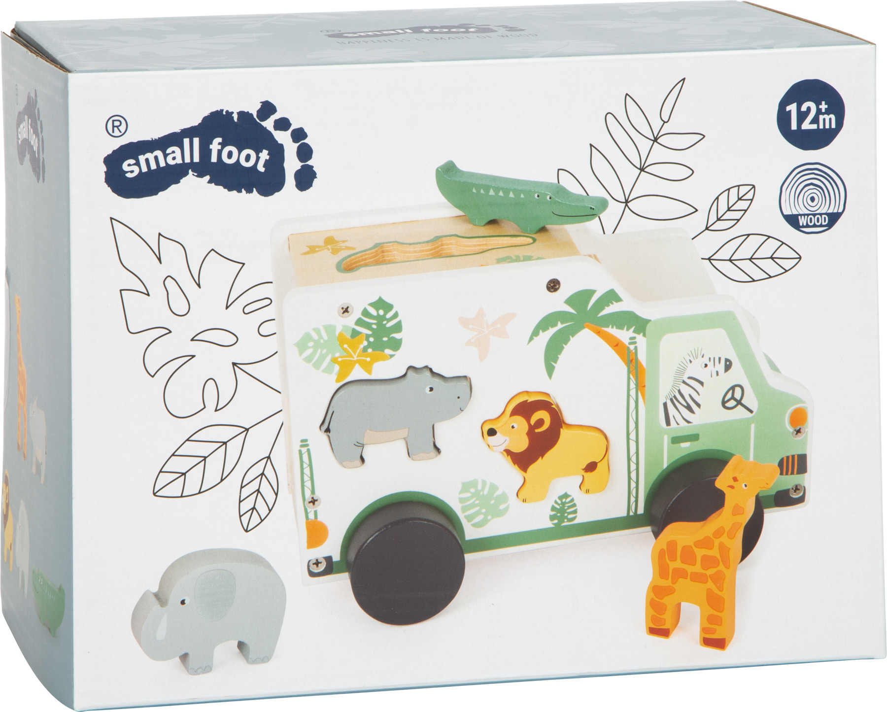 Bussin jokaisella sivulla on viisi eläimen muotoista aukkoa, joihin lapset voivat asettaa oikeat hahmot paikoilleen. Leikki kehittää muotojen tunnistamista, hienomotorisia taitoja ja koordinaatiota, ja samalla kannustaa mielikuvitusleikkiin. Kun kaikki matkustajat ovat kyydissä, safari voi alkaa – ja bussin sisällä on reilusti tilaa eläimille matkan aikana!
