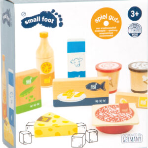 Ruokaostosleikit sujuvat hetkessä tämän puisen ruokasetin avulla! Settiin kuuluu yhdeksän osaa: appelsiinimehupullo, kaksi jäätelöpakettia, hernepussi, kalapuikkoja, voi, juusto, leikkeleitä ja maitopurkki. Lapset voivat ensin ”ostaa” tuotteet leikkikaupasta ja sitten järjestää ne omaan leikkikeittiöönsä jääkaappiin. Kestävästä puusta valmistetut takaa pitkäikäisen keston ja laadukkaan ulkonäön. Selkeät kuvitukset pakkauksissa tekevät leikistä helppoa myös perheen pienimmille.