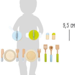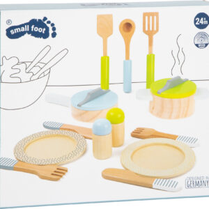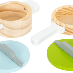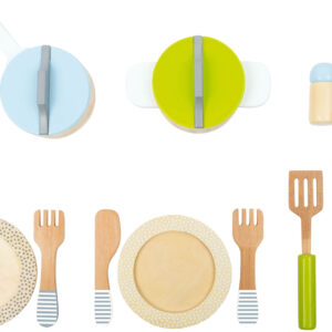 Tällä värikkäällä puuastiastolla ja kattilasetillä ruoanlaitto leikkikeittiössä muuttuu todelliseksi kokkielämykseksi. Kestävästä puusta valmistetut kattilat, pannuja ja astiat kestävät innokkaimmatkin keittiöleikit ja houkuttelevat lapsia kokeilemaan erilaisia ruokalajeja.