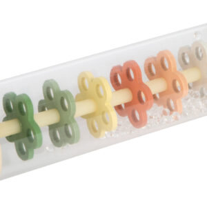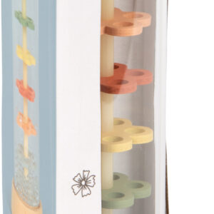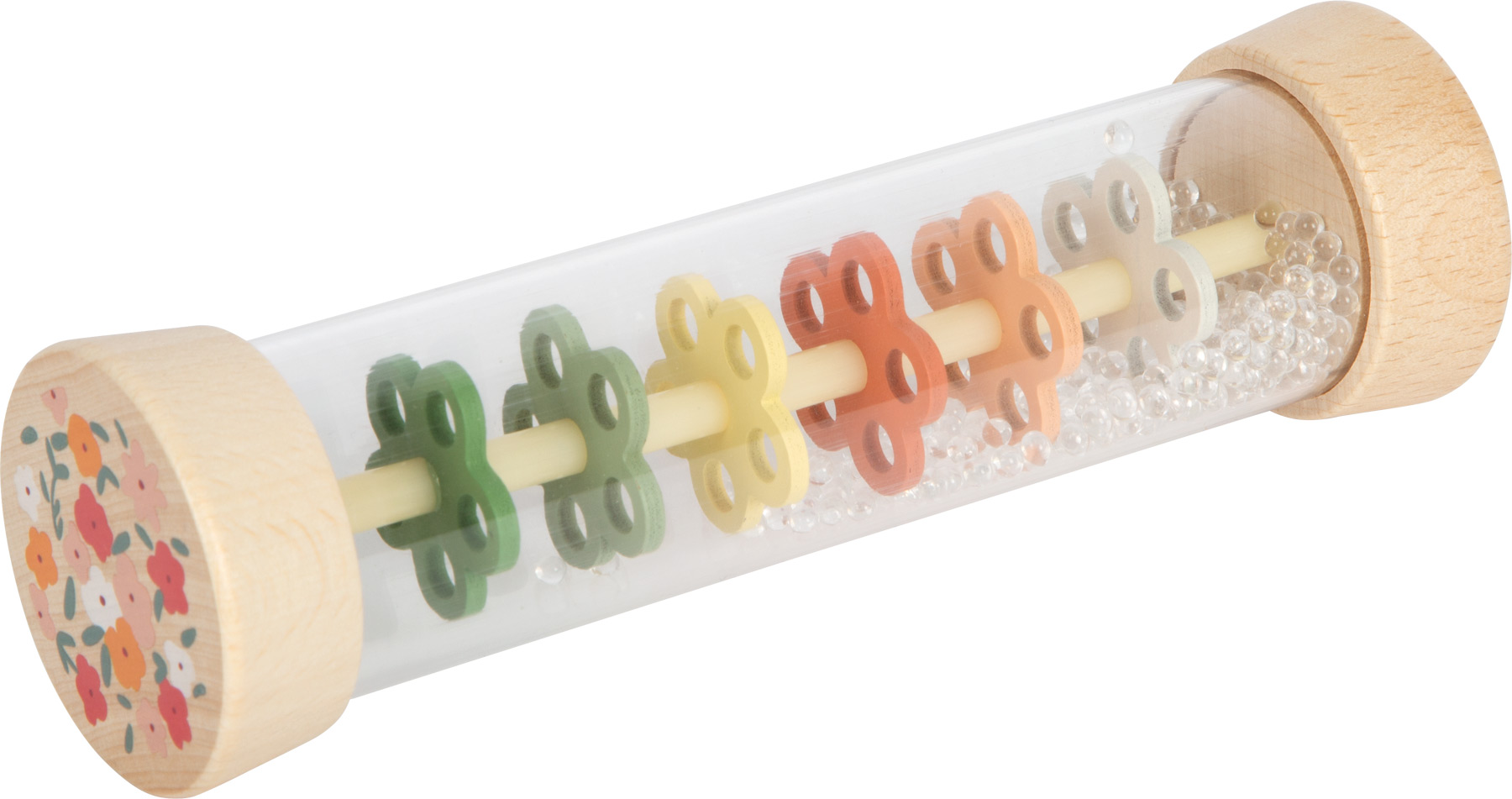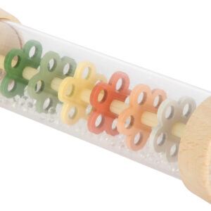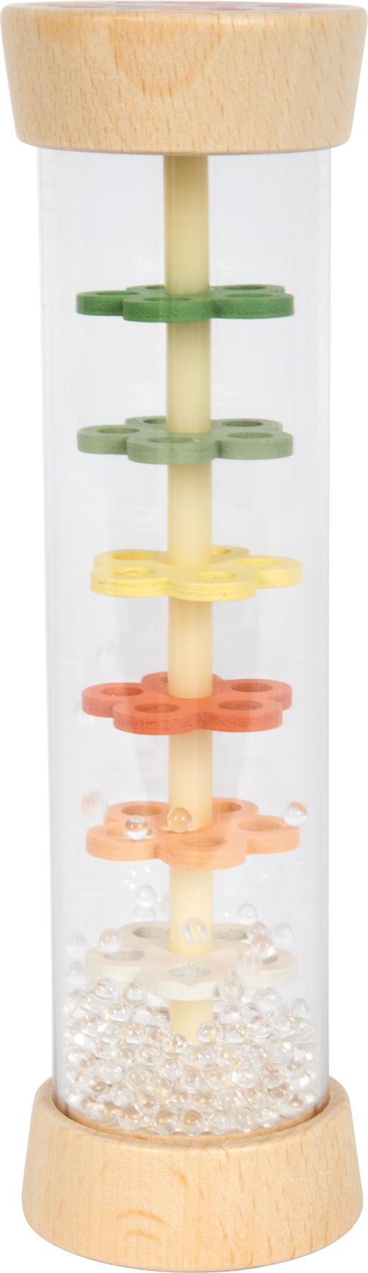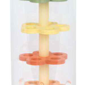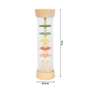 Tämä läpinäkyvä sadesauva tuo pienen sateen äänen lastenhuoneeseen. Kimaltelevat helmet valuvat kukkien muotoisten levyjen läpi ja synnyttävät pehmeän rapinan, joka rauhoittaa ja kiehtoo. Toimii yhtä hyvin ensirytmisoittimena, helistimenä ja rauhoittavana aistileluna – kotona, matkalla ja iltahetkissä.
