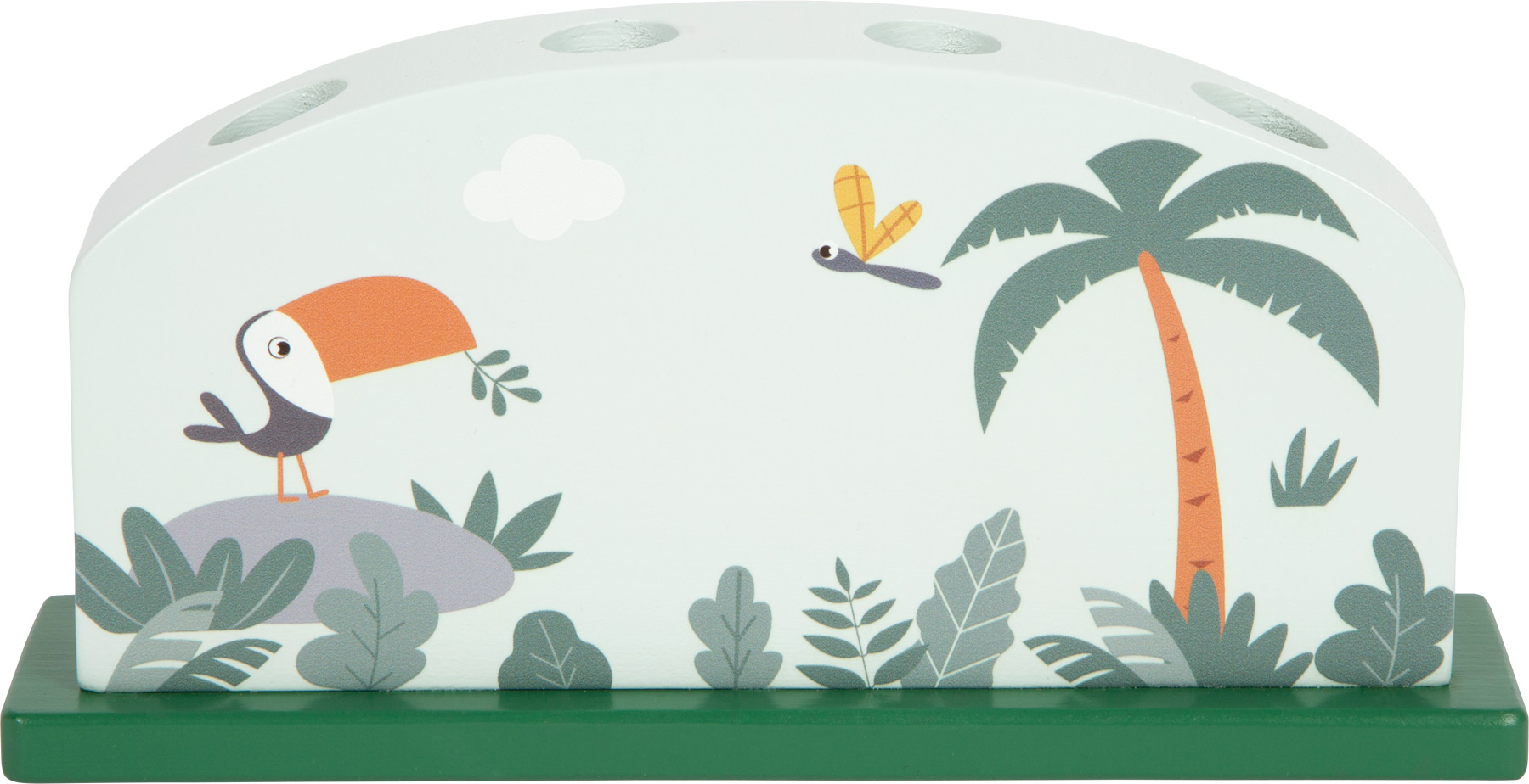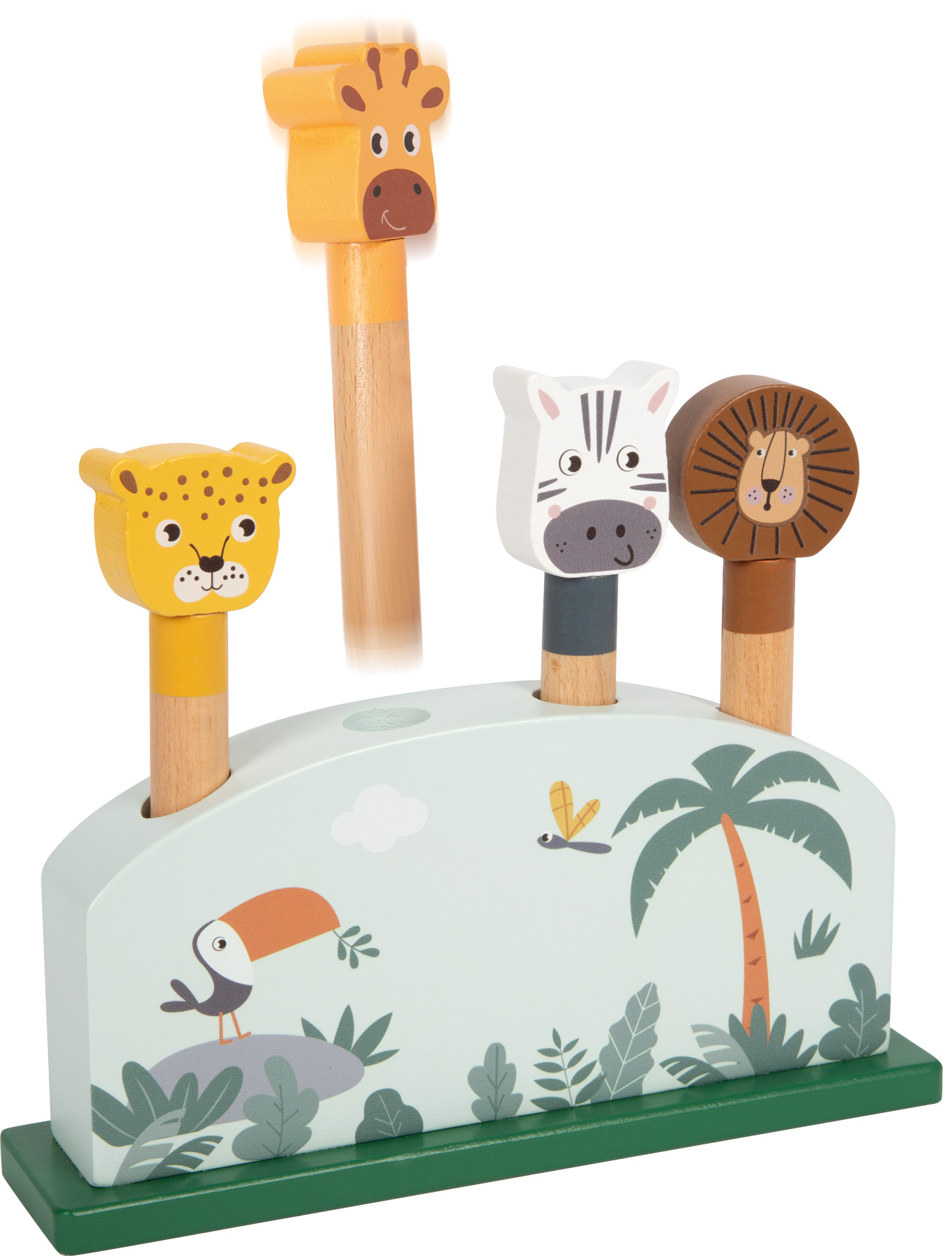 Neljä iloista safarieläintä odottaa hyppyvuoroaan tässä FSC® 100% -sertifioidusta puusta tehdyssä motoriikkalelussa. Lapsi asettaa puueläimet omiin aukkoihinsa ja painaa – jousimekanismi sinkauttaa kirahvin, leijonan, seepran ja leopardin iloisesti pomppaamaan. Leikki harjoittaa tarkkaa otetta, keskittymistä sekä silmä–käsi-koordinaatiota, ja tuo “yllätys!”-hetkiä kerta toisensa jälkeen. Moderni värimaailma ja korkea puupinnan osuus tekevät setistä myös kauniin lisän lastenhuoneeseen.
