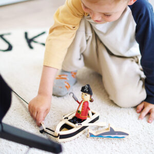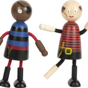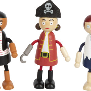Tämä rohkea merirosvolaivue on valmis seilaamaan seitsemän meren halki! Settiin kuuluu kapteeni koukkukädellä, neljä miehistön jäsentä sekä suloinen apina, joka voi tarttua kiinni koukkukäsillään ja hännällään. Nämä puiset taivuteltavat hahmot on päällystetty kankaalla, mikä tekee niistä erittäin joustavia ja kestäviä – täydellisiä mielikuvituksellisiin meriseikkailuihin.