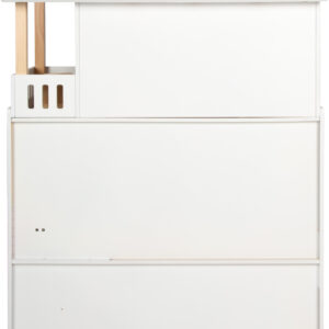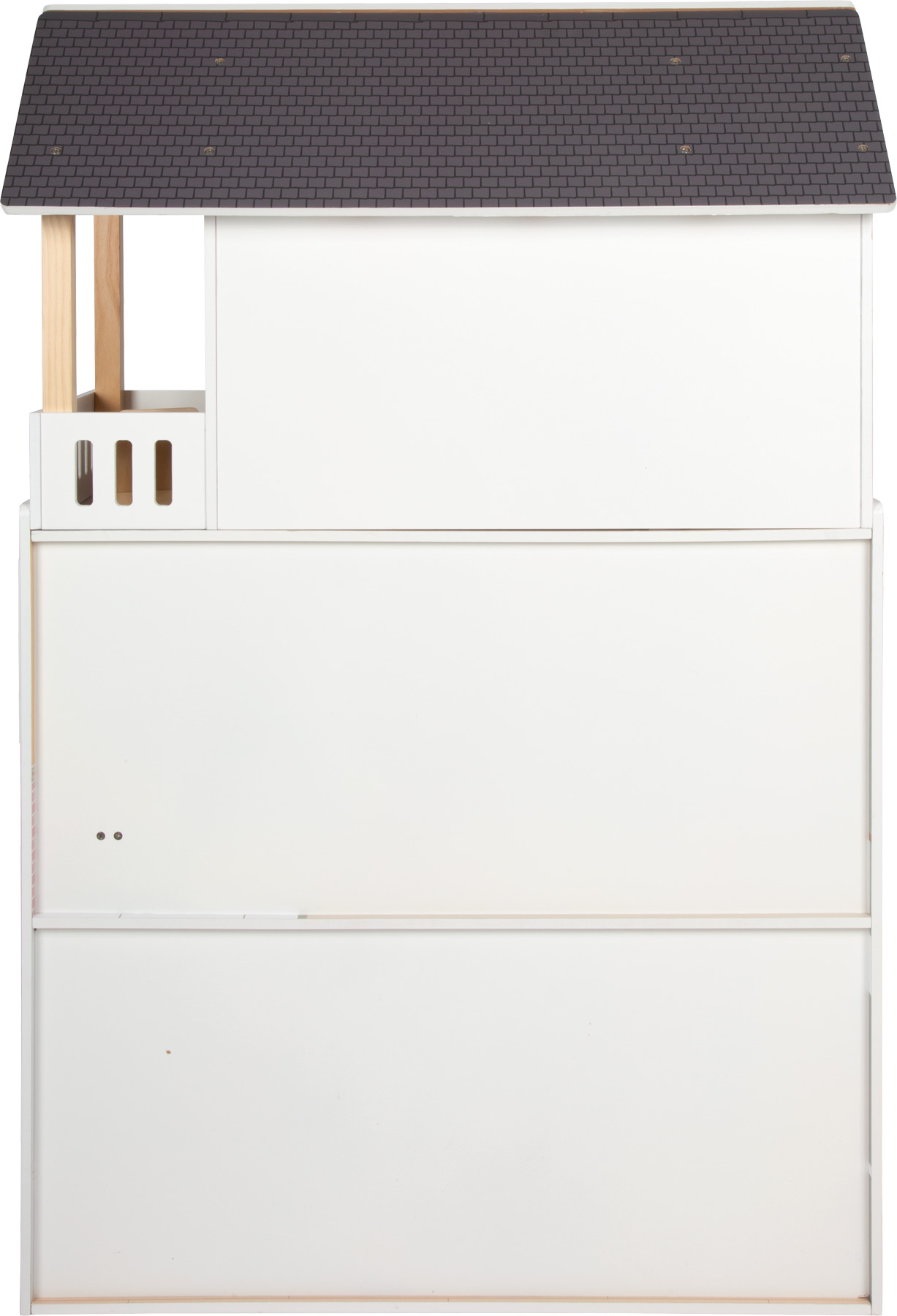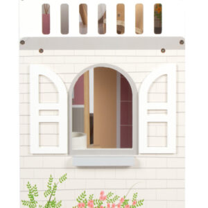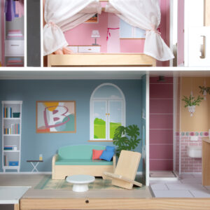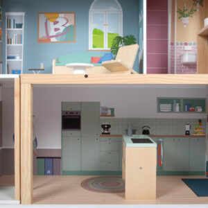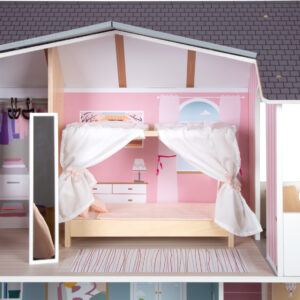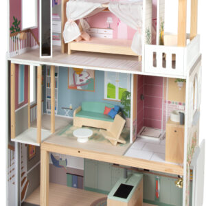 Tämä suurikokoinen nukkekoti on tyylikäs koti jopa 30 cm muotinukeille (1:6). Kolme avointa kerrosta, vaalea puuilme ja yksityiskohtaiset seinäkuvitukset luovat realistisen ympäristön, jossa tarinat syntyvät kuin itsestään. Toimiva hissi kuljettaa nuket kerroksesta toiseen, ja ullakon pukeutumishuone kävelyvaatekaappeineen, vaaterekkineen ja henkareineen kruunaa leikin – nelipylvässänky verhoineen ja suuri kokovartalopeili viimeistelevät tunnelman. Kylpyhuoneessa on akryylilasinen suihkuseinä, seinä-wc saranoidulla kannella sekä moderni tasoallas. Keskikerroksen olohuone (sohva, 2 nojatuolia, pöytä) toimii myös parvekkeella, ja keittiösaarekkeessa on kaksi laatikkoa. Ovikelon kilahdus kertoo, että vieraat ovat saapuneet! Avoin etuosa tekee leikkimisestä sujuvaa useammallekin lapselle yhtä aikaa.