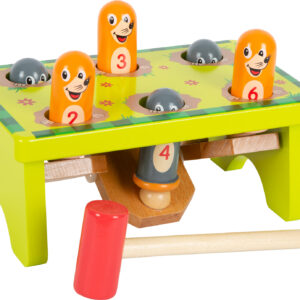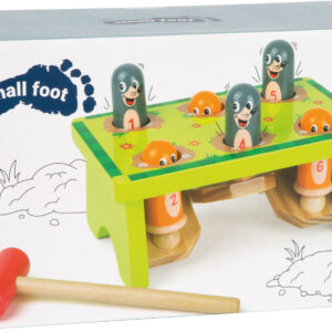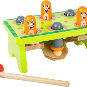 Hauska puinen vasarapeli pienille pelaajille! Pelissä tapahtuva ”myyrämetsästys” tarjoaa riemukasta ajanvietettä ja kehittää samalla motorisia taitoja ja keskittymiskykyä. Kun lapsi iskee vasaralla myyrän päähän, toinen kurkistaa heti esiin toisesta kolosta – yllätys ja nauru ovat taattuja! Numeromerkittyjen kolojen avulla lapsi oppii myös tunnistamaan numeroita leikin ohessa.