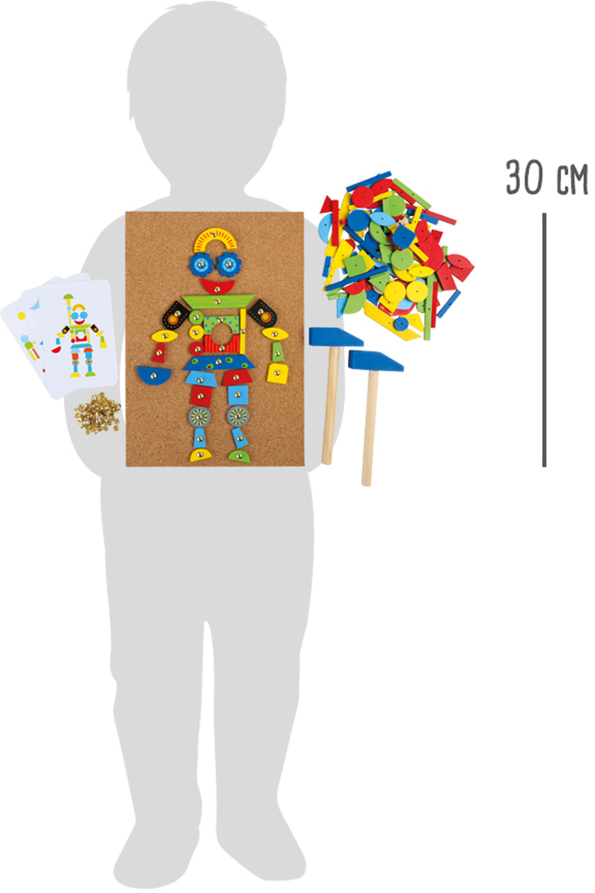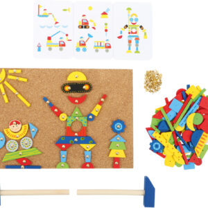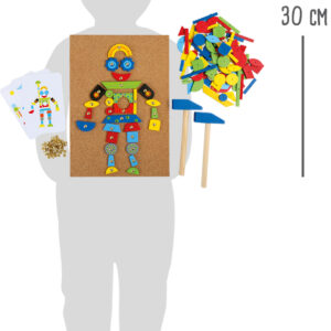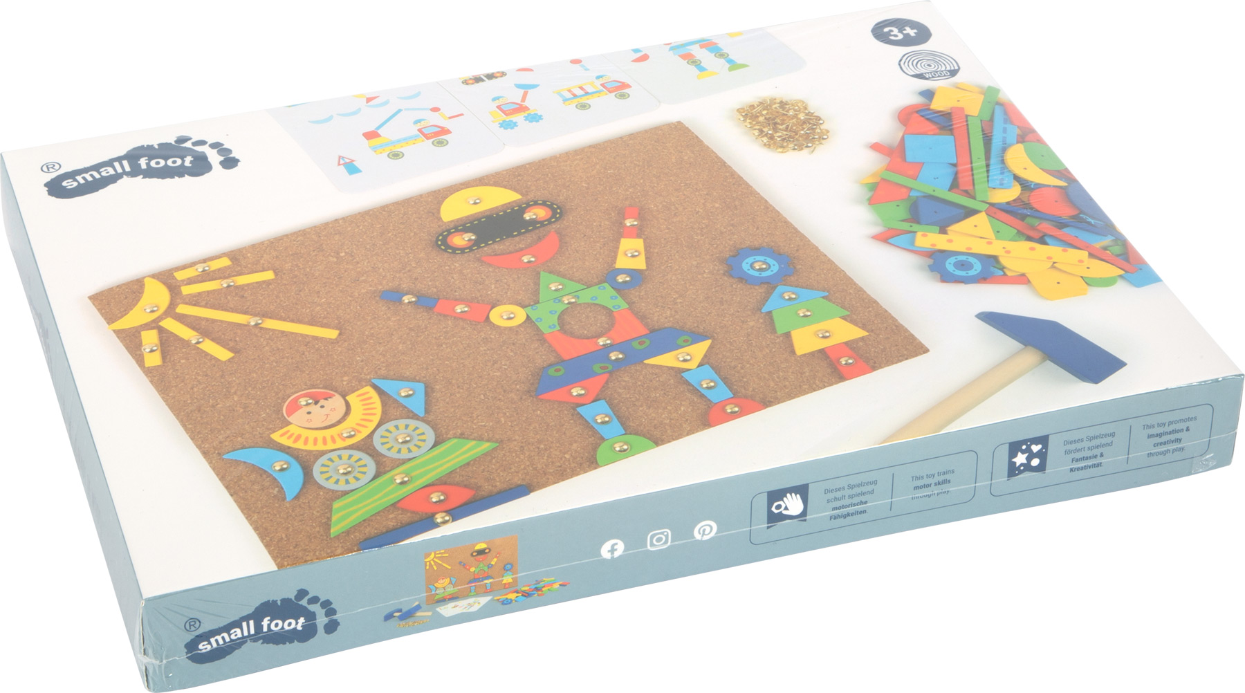 Elastinen korkkitaulu, kaksi pientä puuvasaraa, 100 pikkunaulaa ja 126 värikästä puukuviota kutsuvat suunnittelemaan omia taideteoksia. Lapsi voi naputella junan, robotin tai raketin – tai keksiä aivan omansa. Mukana tulevat 6 kuvamallia ja säilytyslaatikko helpottavat aloitusta ja pitävät osat tallessa, kun taas naputtelu kehittää hienomotoriikkaa, keskittymistä ja luovaa ongelmanratkaisua.