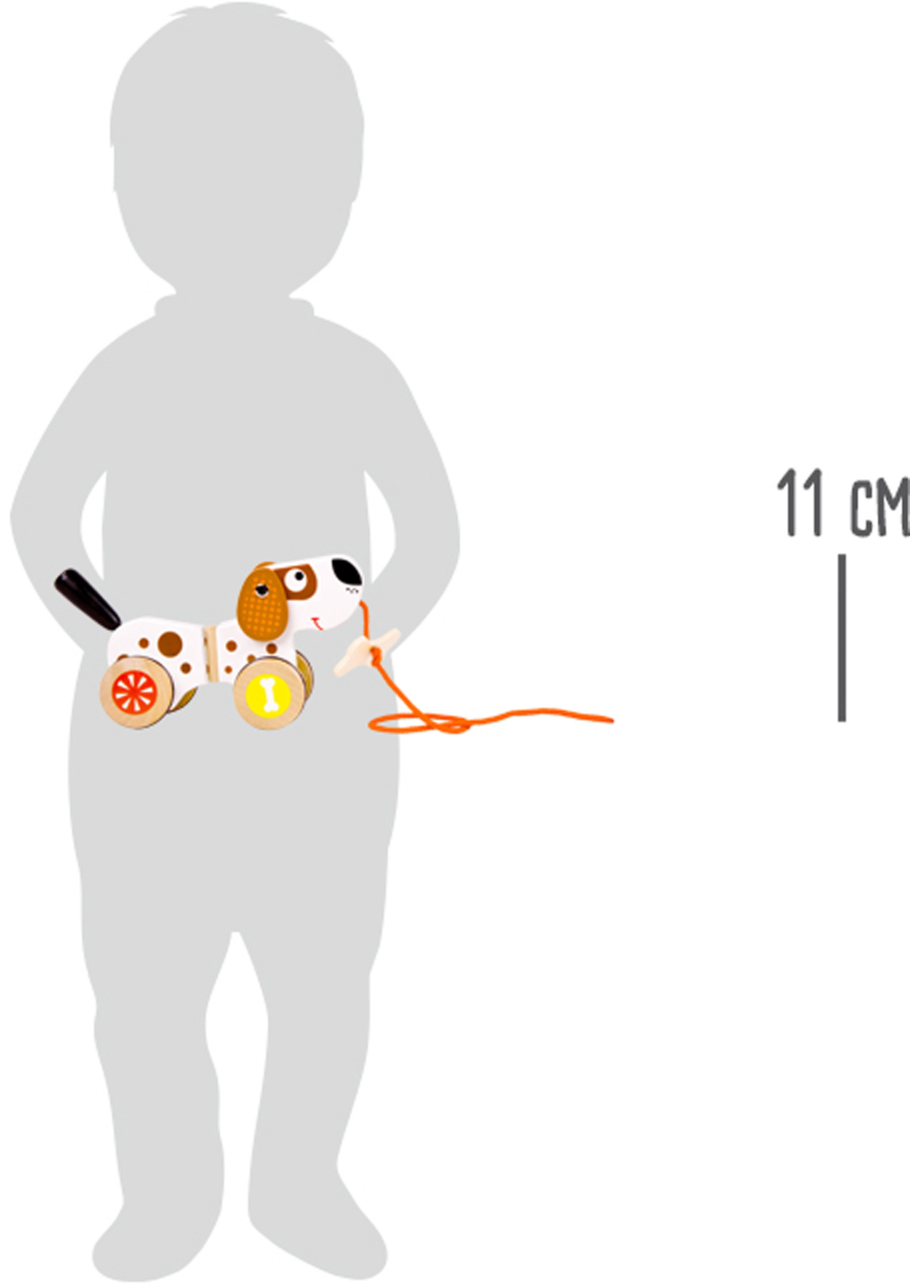 Leikki tämän vedettävän koiran kanssa kehittää lapsen tarkkaavaisuutta, tasapainoa ja hienomotorisia taitoja hauskalla ja turvallisella tavalla. Pyörien kumirenkaat pitävät äänen pehmeänä ja rullaamisen sujuvana, mikä tekee siitä täydellisen sisäleikkeihin. Kirkkaan värinen naru lisää turvallisuutta.